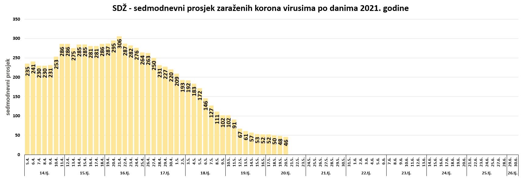 Sadašnji sedmodnevni prosjek broja zaraženih korona virusima manji od pedeset zaraženih dnevno (46 na dan 20.svibanj) zalog je očekivanju da bismo do kraja lipnja mogli biti bez zaraženih koronom ako bismo uspjeli kroz naredna tri tjedna cijepiti još 10% starijih od 18 godina. Stariji od 65 i kronični bolesnici trebali su već biti potpuno cijepljeni s dvije doze.