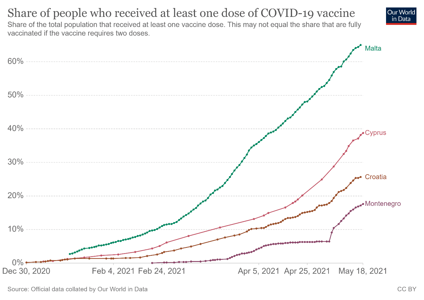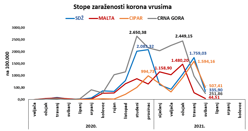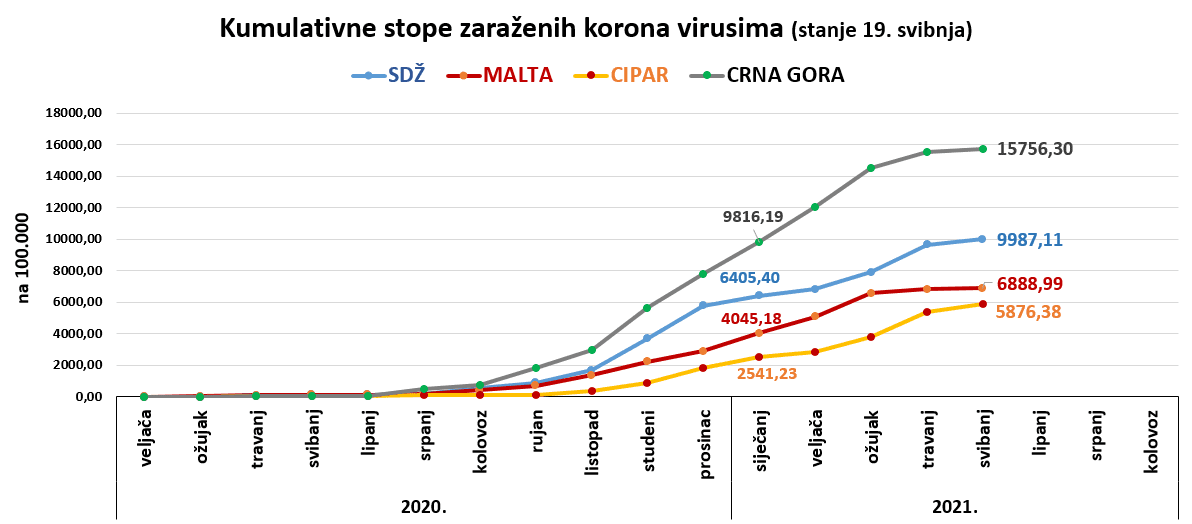 Crna Gora svoje povoljnije stanje od Cipra u svibnju ne može zahvaliti procijepljenosti. Cijepljenje je počelo tek krajem travnja i cijepna otpornost kod stanovništva kroz nešto više od dva tjedna nije se mogla postići. Zahvaljujući samo ranijoj vrlo visokoj prokuženosti došlo se do stanja početka gašenja epidemije zbog potrošenosti epidemijskog potencijala. Očito da je broj zaraženih u Crnj Gori znatno iznad procijenjenog broja. PCR dijagnostiku zaraženih provodili su slanjem obrisaka u laboratorije u Njemačkoj. Uostalom izuzetno visoka stopa smrtnosti od COVID-19 u Crnoj Gori 2.498 umrlih na milion stanovnika govori da je zaraženost kronom bila znatno veća. Usporedbe radi smrtnost na Cipru 288/milion, Malti je 942/milion, a u SDŽ 1.356/milion.