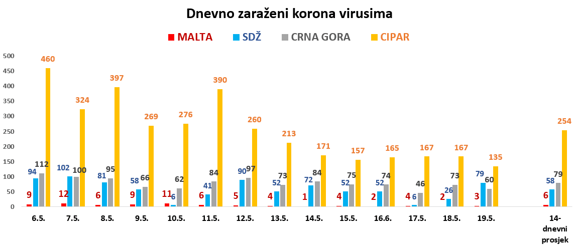 Sve zemlje bilježe smanjenje broja zaraženih ali samo Malta bilježi jednoznamenkasti broj dnevno zaraženih koronom. Dnevni prosjek za posljednjih 14 dana je šest zaraženih na Malti, u SDŽ 58 zaraženih, u Crnoj Gori 79 i na Cipru najveći 254 zaražena dnevno.