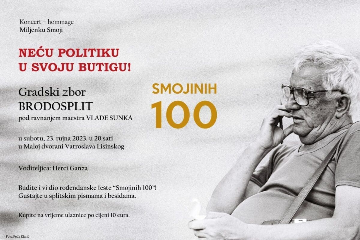 Pod okriljem manifestacije Grada Splita „SMOJINIH 100“, najtrofejniji je hrvatski muški amaterski zbor Gradski zbor Brodosplit pod ravnanjem maestra Vlade Sunka priredio koncert – hommage Miljenku Smoji NEĆU POLITIKU U SVOJU BUTIGU!