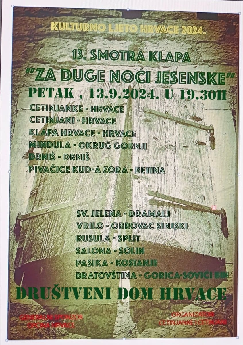 Petak 13.9. u 19:30 sati - Tradicionalna smotra klapa „Za duge noći jesenske“ u organizaciji klapa Cetinjanke i Cetinjani (Udruga klape Hrvace).