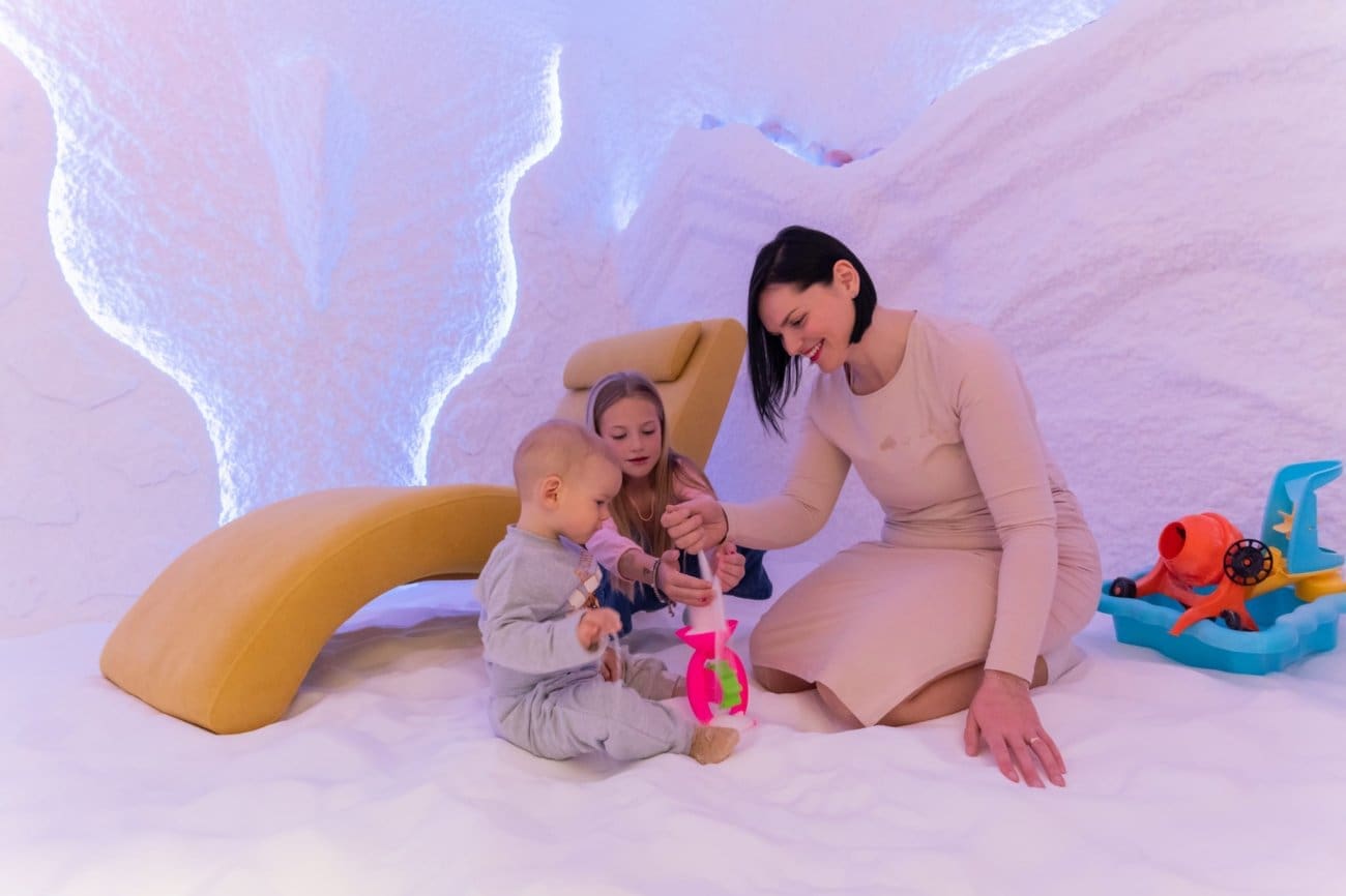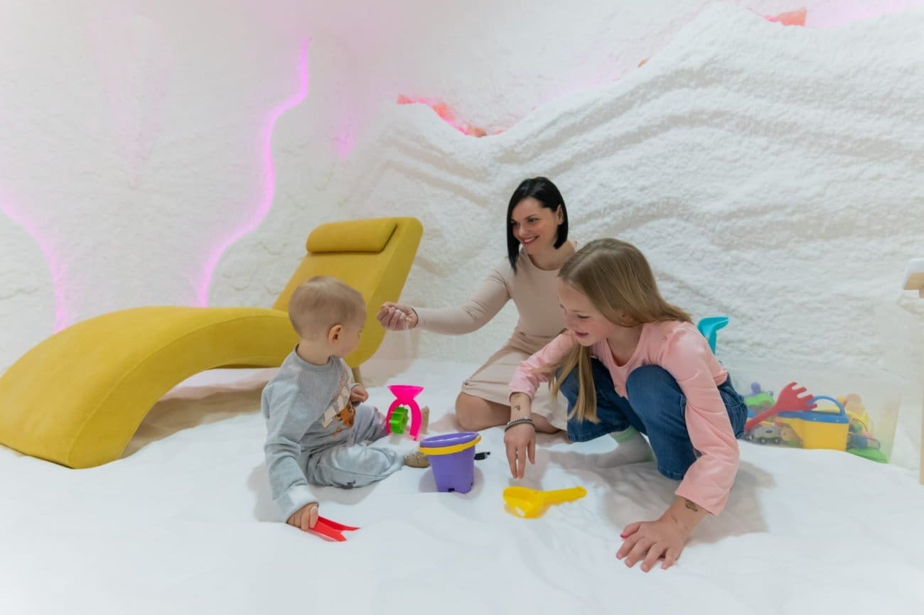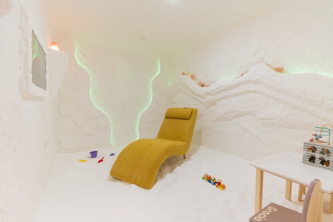 U slanoj sobi djeca se najčešće zabavljaju igrom pa tako umjesto pijeska, koriste sitne kristale soli kako bi gradila kule i kopala bagerima. Dok oni uživaju u kreativnoj igri, odrasli se mogu opustiti u udobnim foteljama, uz laganu glazbu iz zvučnika i smirujuće promjene svjetlosnih efekata na stropu.