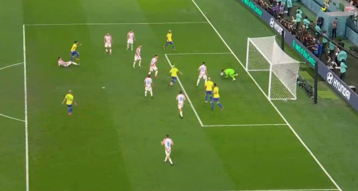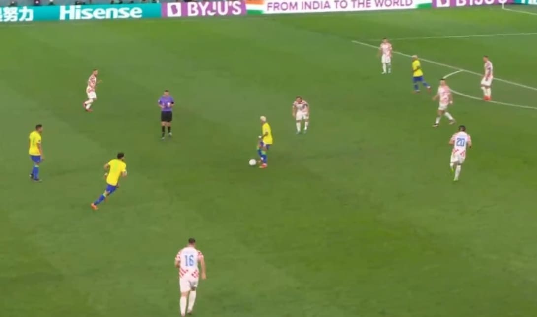 106' Gol. Neymar 1-0 za Brazil. Dupli pas izbacio je svemirca u gol šansu, Sosa nije stigao, i Neymar stiže pred Livakovića, zaobilazi ga i zabija...