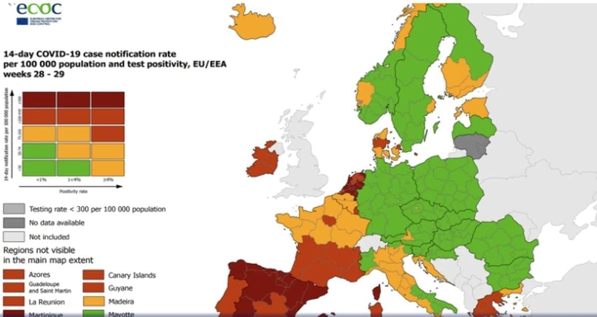 U narančastoj boji je Francuska, Island, Estonija, većina Italije, dio Finske, Norveške i Danske, dok su crvenom označene Sicilija, Sardinija, Španjolska, Portugal, Irska, Nizozemska, dio Grčke i Danske, piše HRT.