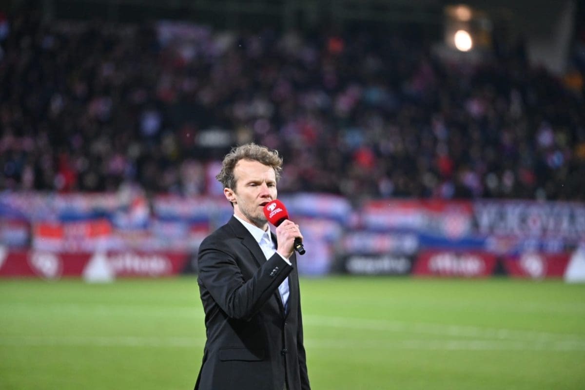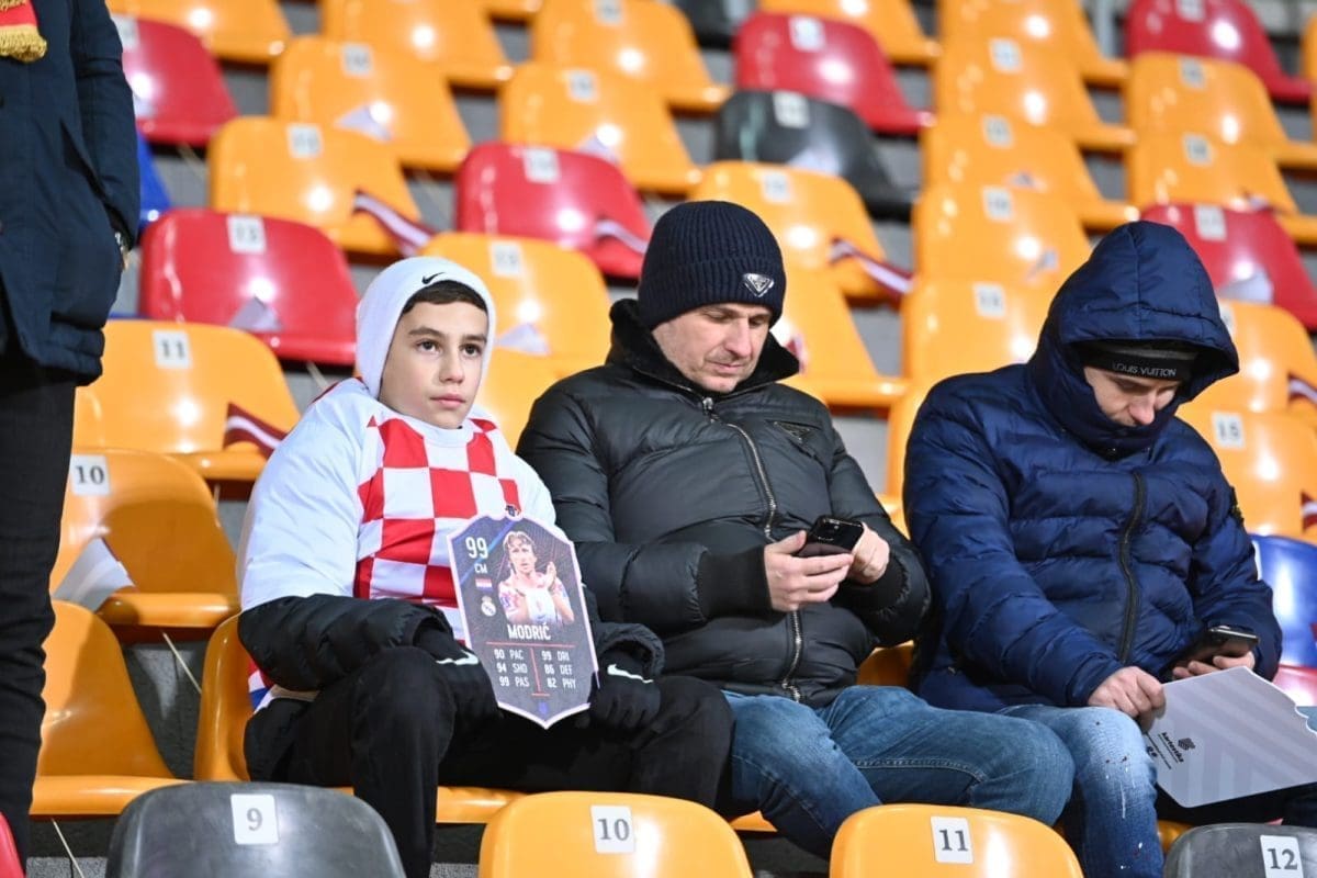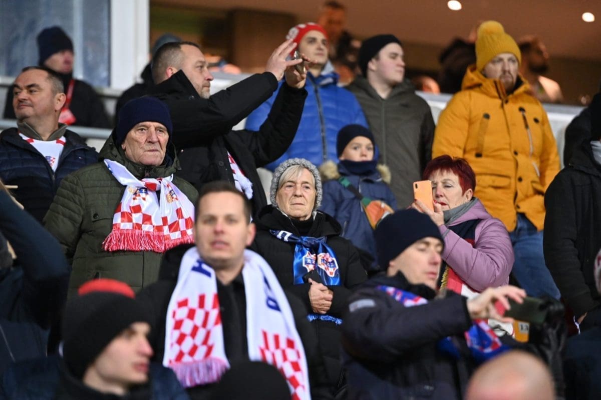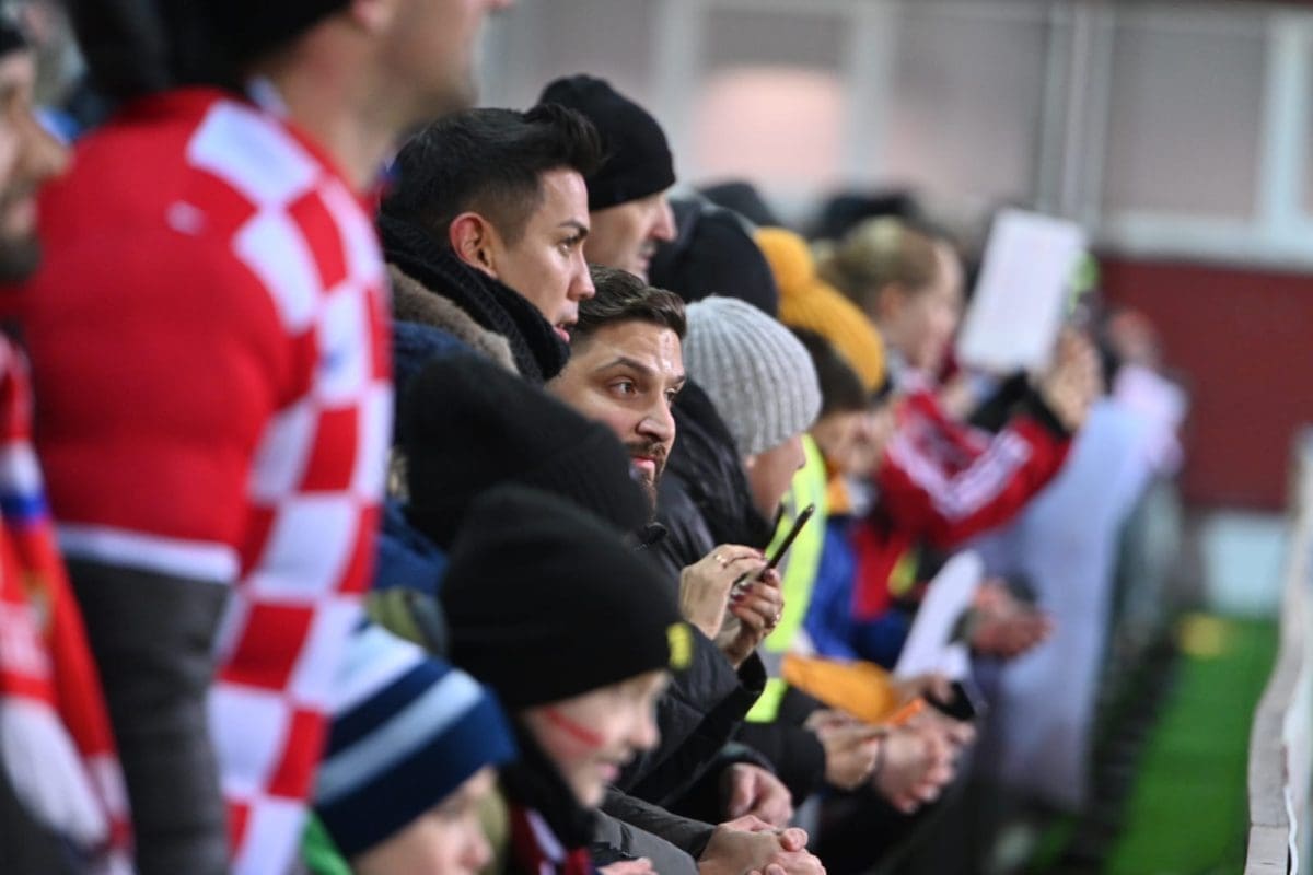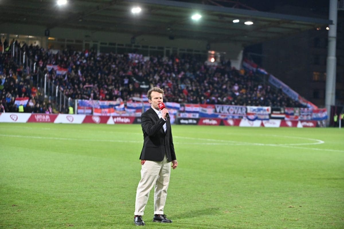 Djeca s tribina traže dresove nogometaša, izvješeni su brojni transparenti, posebno u oko upada onaj na kojem je slika vukovarskog vodotornja. Na tribinama se može uočiti i jedno poznato lice, pogledajte i sami u galeriji našeg Roka Pavlinušića o kojem je legendarnom televizijskom voditelju riječ.