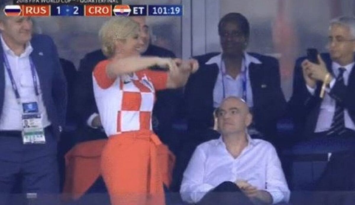 Za vrijeme sinoćnjeg četvrtfinalnog susreta boravila je u svečanoj loži u društvu ruskog premijera Dmitrija Medvedeva. Predsjednica je utakmicu pratila i Vatrene bodrila u kockastom dresu, a čak je i zaplesala nakon Vidinog gola.