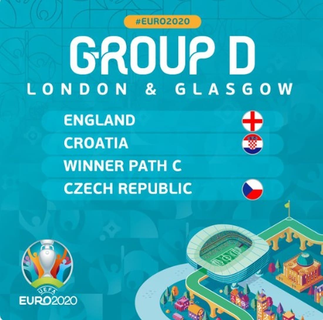 Izabranici Zlatka Dalića tako će zaigrati protiv Engleske (14. lipnja, London), Češke (19. lipnja, Glasgow) i pobjednika doigravanja puta C (23. lipnja, Glasgow). Za preostalo će se mjesto u ožujku iduće godine natjecati Škotska, Norveška, Srbija i Izrael.