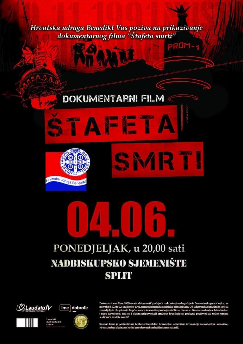 Hrvatska udruga Benedikt poziva na prikazivanje dokumentarnog filma “Štafeta smrti” koje će se održati u ponedjeljak, 4. lipnja 2018., s početkom u 20 sati u velikoj dvorani Nadbiskupskog sjemeništa u Splitu (Zrinsko-frankopanska 19).