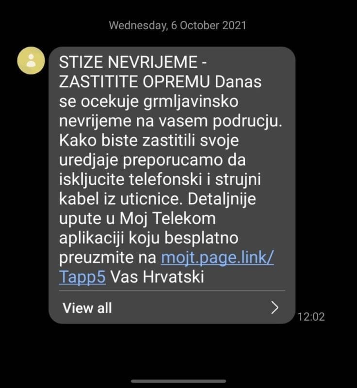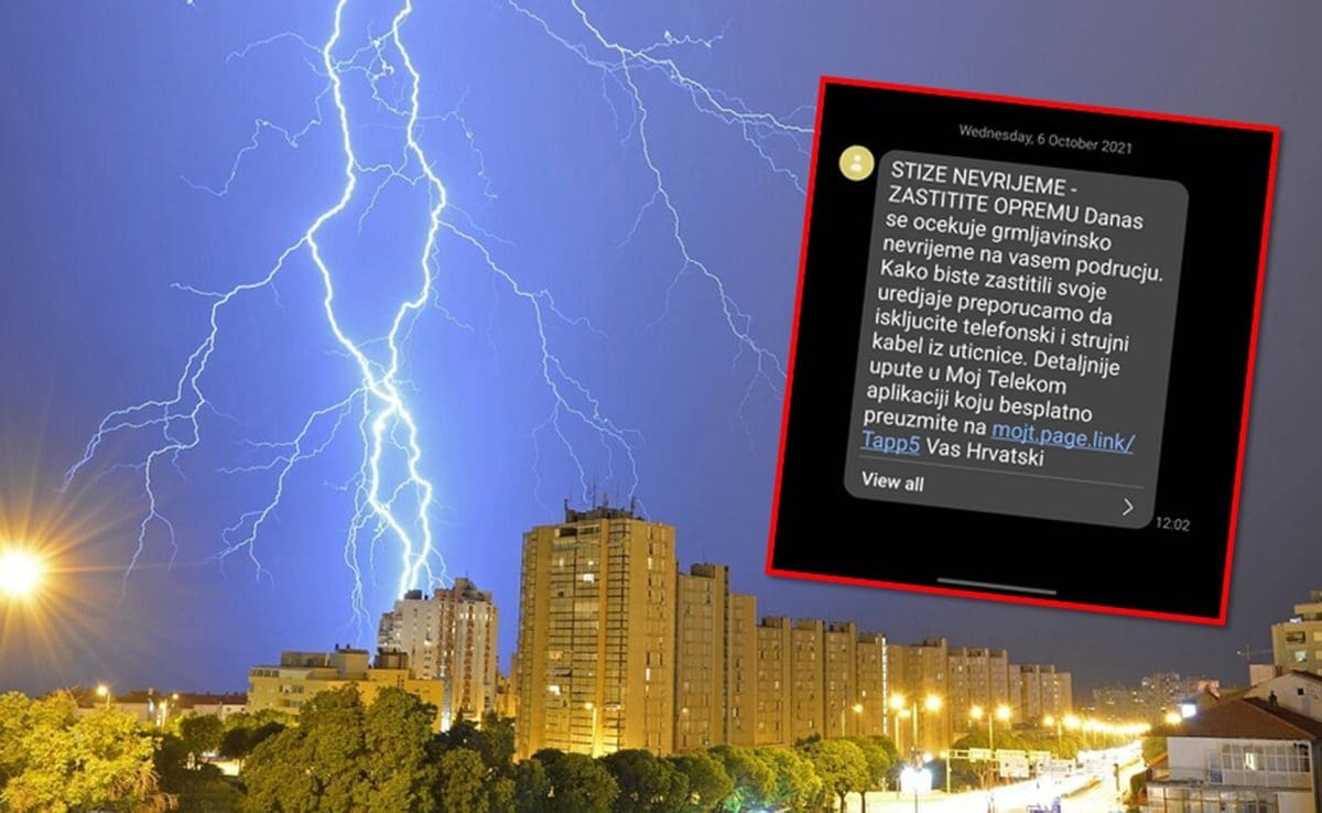 "Danas se očekuje grmljavinsko nevrijeme na vašem području. Kako biste zaštitili svoje uređaje preporučamo da isključite telefonski i strujni kabel iz utičnice", piše u poruci.