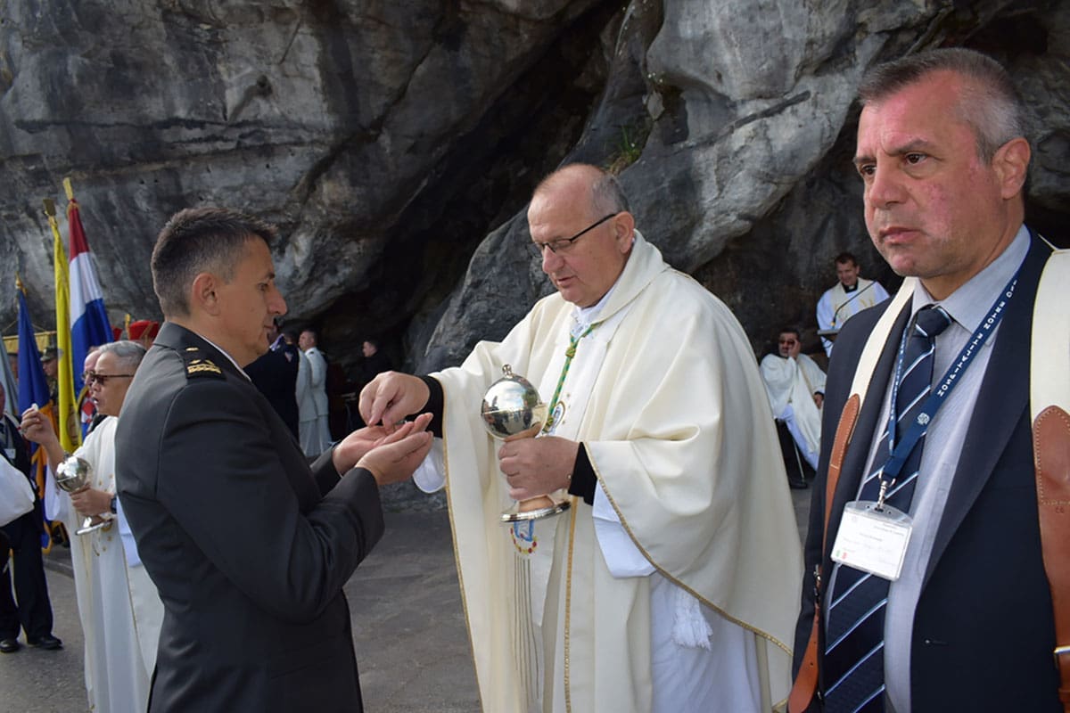 Naglasio je kako do vojski svijeta, među kojima je i Hrvatska vojska i policija dopiru poruke mira iz Lourdesa. Zato mu i hodočaste. Podsjetio je hrvatske hodočasnike na geslo ovogodišnjeg hodočašća: "Traži mir i za njime idi". Mir treba tražiti u sebi, u našim obiteljima, Isusu i njegovoj majci. To je mir koji tražimo i za kojim idemo, istaknuo je u nadahnutoj propovijedi vojni biskup Jure Bogdan.