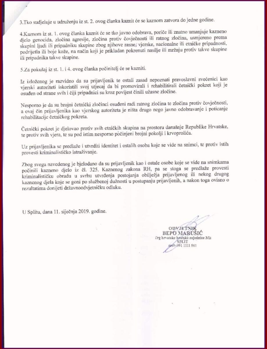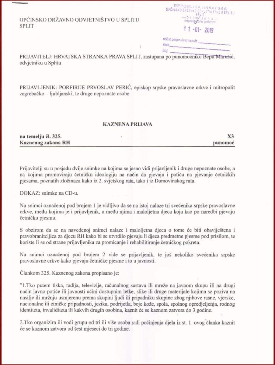 Hrvatska stranka prava, Podružnica Split kazneno je prijavila Porfirija Prvoslava Perića, episkopa Srpske pravoslavne crkve i mitropolita zagrebačko-ljubljanskog te druge nepoznate osobe.