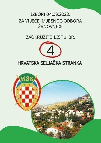 Na nedjeljnim kotarskim izborima HSS u Žrnovnici izlazi samostalno. Nositelj liste je Marijo Jerković - poštar, a iza njega su Marin Tijardović - Balaturin, Vladimir Aljinvić - Zorin, Anamarija Jerković - Tina, Tomislav Aljinović - Rus, Ante Roguljić - Car i Siniša Marin - Prkićev.