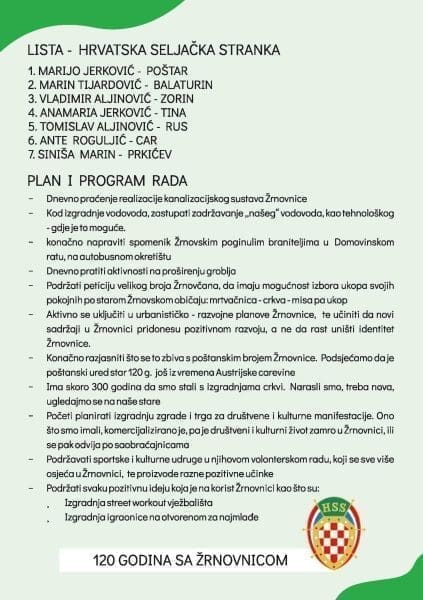 - HSS je stranka staraju 120 godina, nastala još u Austro Ugarskoj monarhiji. HSS je zastupala i borila se za Hrvatsku državotvornost i za stanovništvo Hrvatske. Poznato nam je da ništa ne dolazi bez teškog truda i žrtve. I danas Žrnovnici ima svoj HSS, te ljude koje baštine te ideje, baš kao i nekada. Za ove izbore poprilično smo jasno detektirali probleme Žrnovnice i predložili plan "želja". Ne očekujući da će se sve preko noći riješiti, ali za neke prijedloge dobroj je da se i počne o njima govoriti - govori nam Jerković, nositelj liste.
