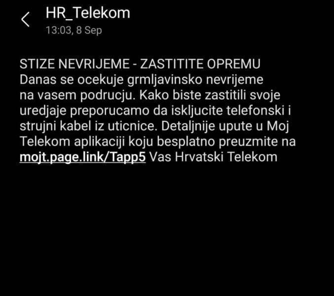 Hrvatski telekom je svojim korisnicima s područja Dalmacije poslao obavijest o mogućem grmljavinskom nevremenu.