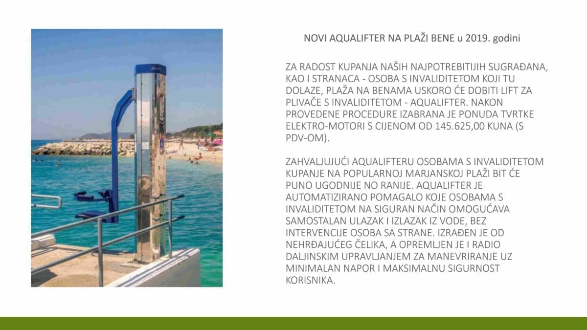 Sukladno prijedlogu osoba s invaliditetom da se lift na Benama zamijeni onim kakav je na plaži Žnjan, nakon provedene nabave, trenutno se izvode pripremne radnje za instalaciju istoga, a postojeći lift će biti prebačen na neki od bazena sa slatkovodnom vodom, budući je za takve adekvatniji.