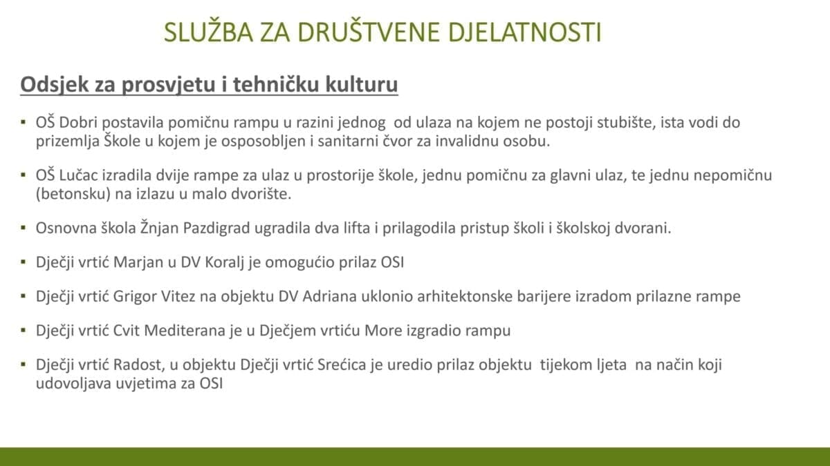 - Ustanova DES za zapošljavanje, rad i profesionalnu rehabilitaciju osoba s invaliditetom - Split, po prvi put ove godine zahvaljujući projektu za koji su sredstva dobili na natječaju Zavoda za vještačenje, profesionalnu rehabilitaciju i zapošljavanje osoba s invaliditetom Zagreb, s ciljem povećanja upošljivosti OSI, osim cjelovite energetske obnove dobila je sredstva za PRVI lift za osobe s invaliditetom u toj ustanovi, a koja djeluje od 1949. u Splitu te zapošljava više od 50% osoba s invaliditetom. Pripreme za instalaciju lifta su započele, a bit će dovršen proces u listopadu ove godine - kaže nam Hrgović Tomaš.