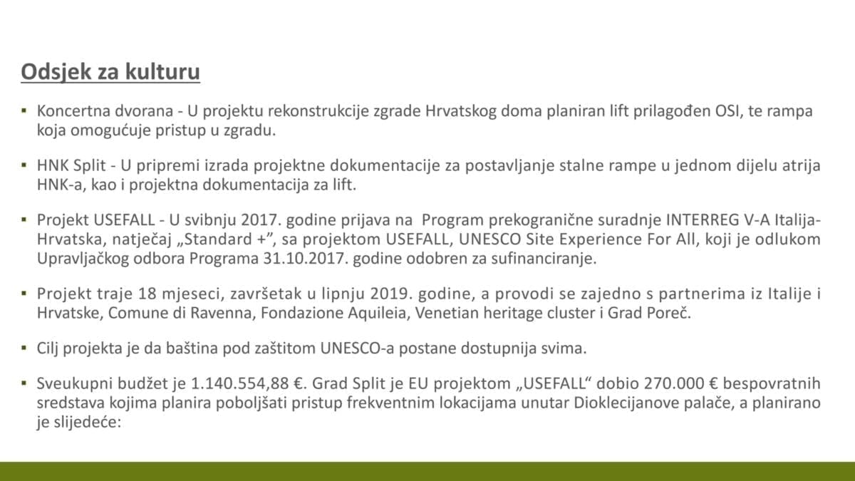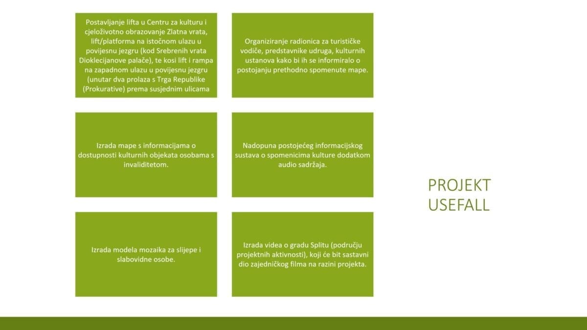 - Osim navedenih projekata, među kojima je najpoznatiji Useful - projekt pristupačnosti Stare gradske jezgre, koji obuhvaća dvije rampe (Prokurative i Srebrna vrata) i lift u Centru Zlatna vrata, a koji će biti dovršen do konca rujna, u tijeku je niz aktivnosti koje navodimo u nastavku.
