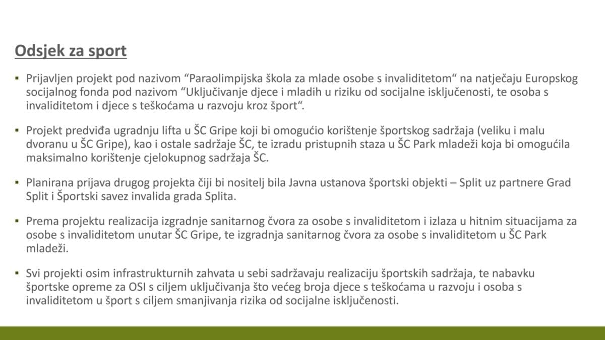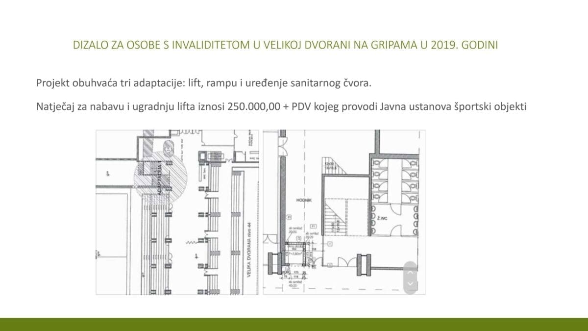 U tijeku je i nabava lifta za Športski centar Gripe Javne ustanove športski objekti zahvaljujući projektnoj prijavi za povećanje pristupačnosti športskih objekata ostvarenoj u partnerstvu sa Športskim savezom invalida Split, a projekt uključuje i niz sportskih programa za OSI. Prošle godine ishodili smo dokumentaciju za lift što je bio preduvjet za prijavu.