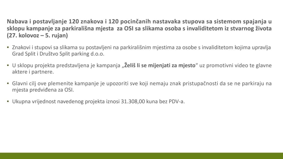 Posebno zahvaljujući entuzijazmu članova, podupiratelja i prijatelja inicijative Za pristupačni Split, koji i nas motiviraju da budemo entuzistijačniji i energičniji u rješavanju problema, brojni naši sugrađani realiziranjem ovih projekata imat će kvalitetniji život u gradu - zaključuje splitska dogradonačelnica.