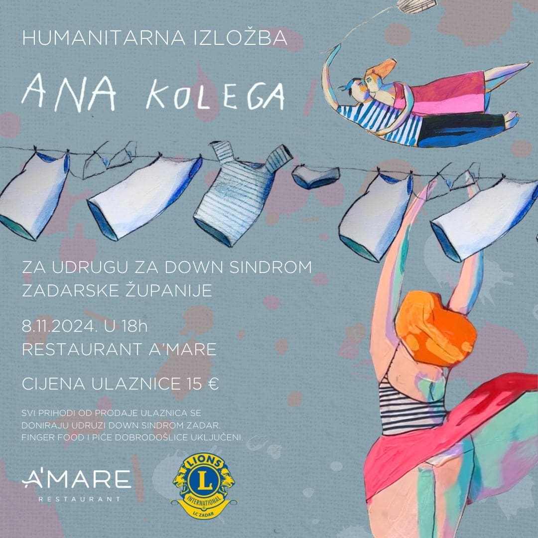 Nastavljajući svoje humanitarne aktivnosti Lions klub Zadar zajedno s hotelom A'Mare i zadarskom umjetnicom Anom Kolega priređuje humanitarnu prodajnu izložbu čiji je prihod namijenjen Udruzi za Down sindrom Zadarske županije. Izložba će biti otvorena u petak, 8.11.2024. u restoranu A'Mare u 18 sati.