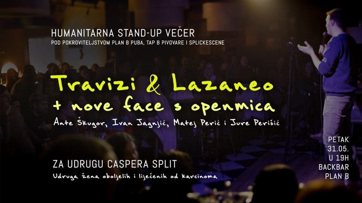 Na Humanitarnoj stand-up večeri će nastupiti komičari SplickeScene Ante Travizi i Ivica Lazaneo uz nove face sa open mic večeri na kojima se kale nove splitske komičarske nade. Ovom prilikom predstavit će vam se Ante Škugor, Ivan Jagnjić, Matej Perić i Jure Perišić.