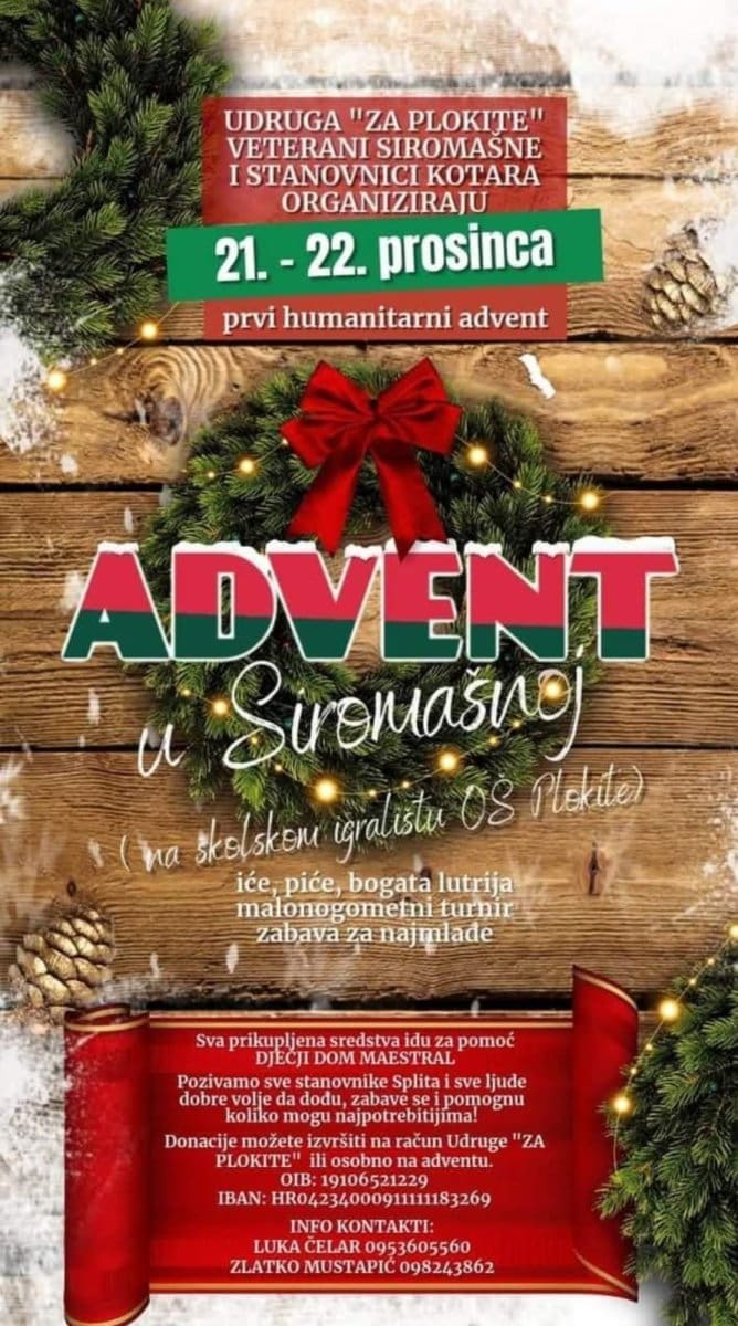 Udruga "Za Plokite", Veterani Siromašne i stanovnici kotara zajedničkim snagama organiziraju prvi humanitarni advent, koji će se održati 21. i 22. prosinca na školskom igralištu OŠ Plokite. Ovaj jedinstveni događaj donosi blagdanski duh i priliku za pomoć najpotrebitijima, a sva prikupljena sredstva bit će donirana Dječjem domu Maestral.