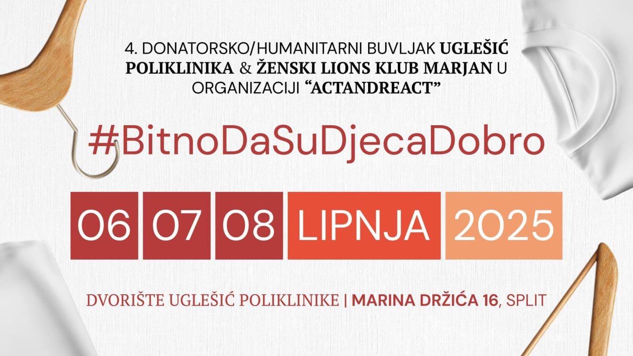 U organizaciji inicijative actandreact, Ženskog Lions kluba Marjan i Poliklinike Uglešić, u Splitu će se održati četvrti po redu donatorsko-humanitarni buvljak pod sloganom #BitnoDaSuDjecaDobro. Događanje će trajati tri dana — od 6. do 8. lipnja 2025. — u dvorištu Poliklinike Uglešić, na adresi Marina Držića 16.