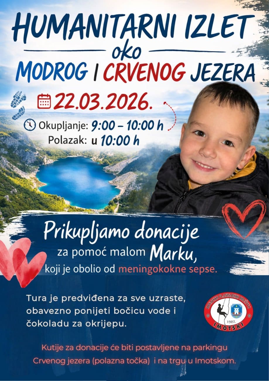HPD Imotski organizira humanitarni izlet oko Crvenog i Modrog jezera s ciljem prikupljanja donacija za Marka, a organizatori pozivaju građane da se odazovu u što većem broju i tako pruže podršku njemu i njegovoj obitelji.