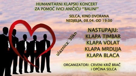 Općina Selca i Crveni križ Brač organiziraju humanitarni koncert bračkih klapa koji će se održati 8. travnja, s početkom u 19 sati, u kino dvorani u Selcima, piše Brač online.