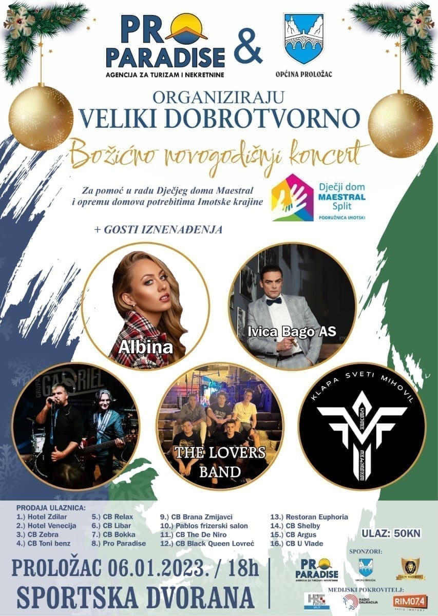 Danas, na Blagdan Sveta tri kralja, Bogojavljenje i Vodokršće, u sportskoj dvorani u Prološcu će se održati zanimljiv humanitarni glazbeni događaj naziva "VELIKI DOBROTVORNO Božićno novogodišnji koncert". Koncert započinje u 18 sati, a cijena ulaznice je 50 kuna - 6.64 eura.