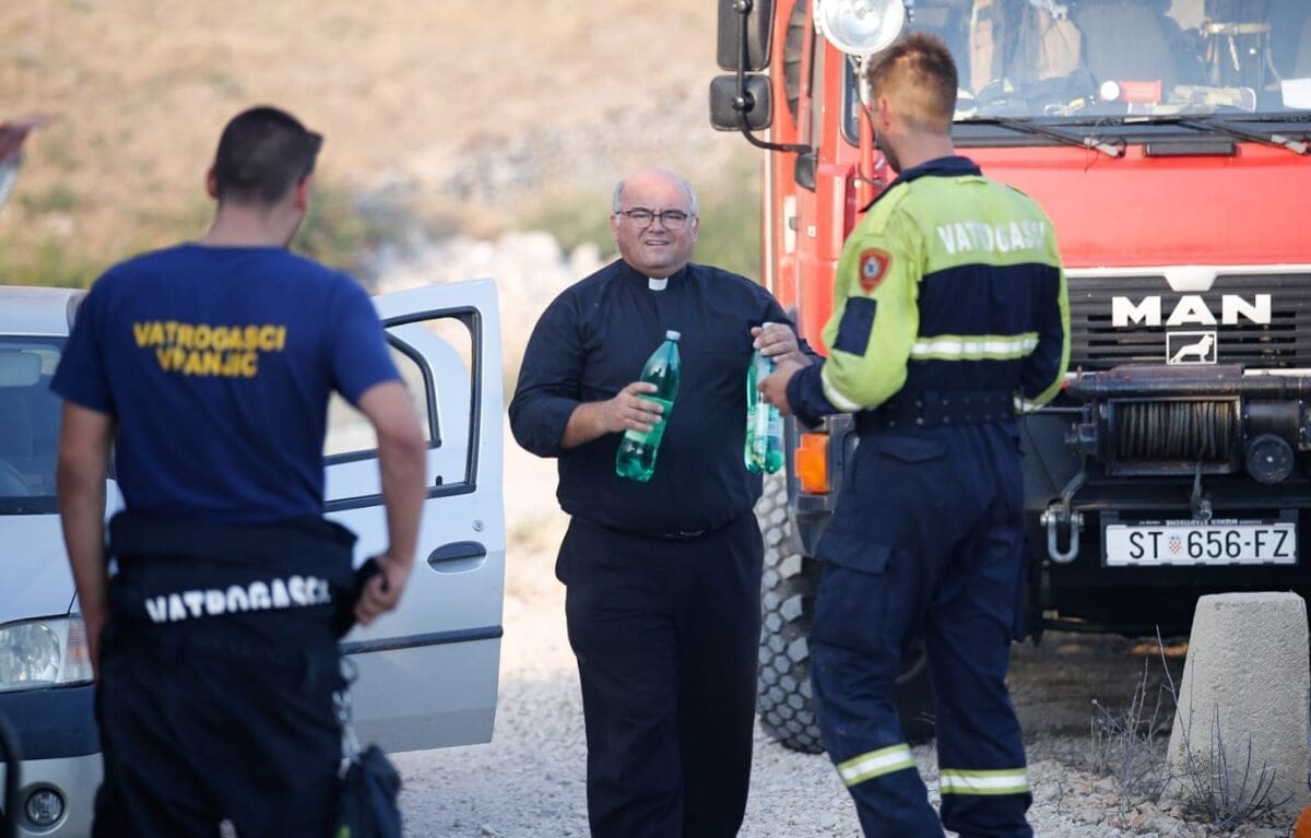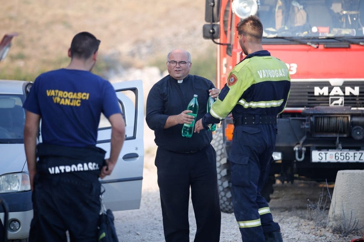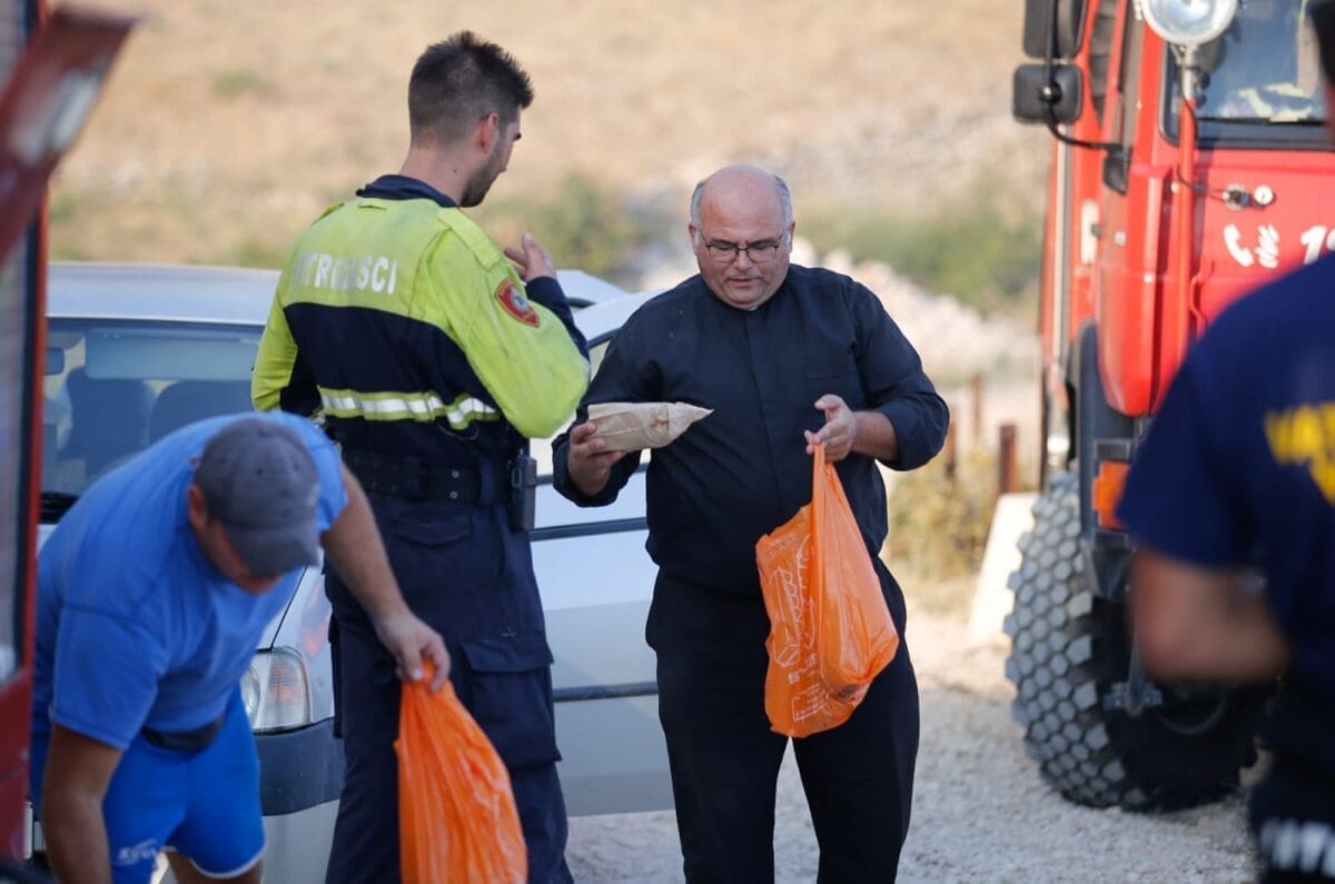 Iscrpljenim vatrogascima donio je hranu i piće, a na naš upit da nam otkrije iz koje župe dolazi i svoje ime ostao je skroman i rekao kako za sve što nas zanima upitamo vatrogasce.