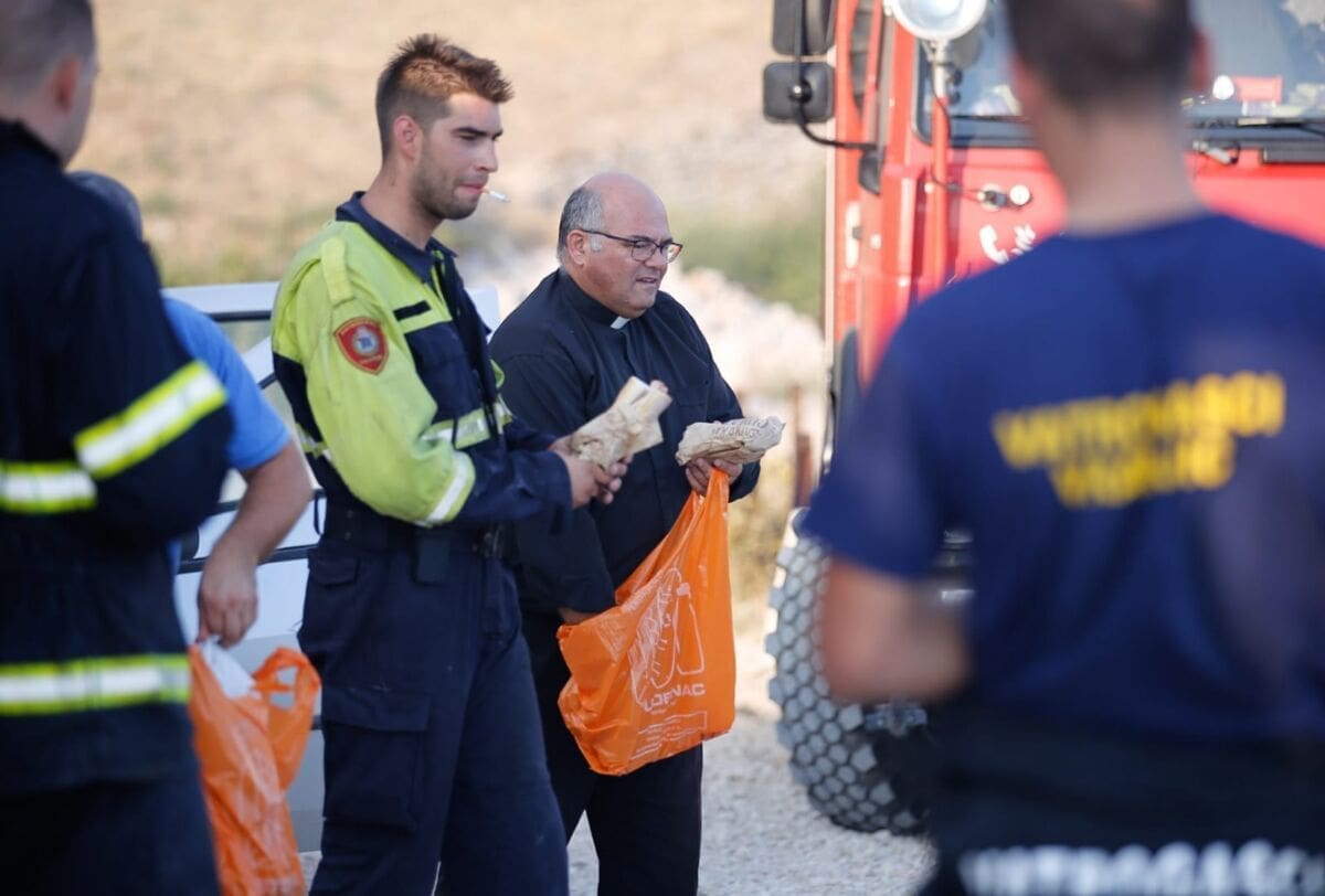 Vatrogasci se s vatrom, potpomognutom vjetrom, bore već više od 5 sati. Umorne vatrogasce kod lokalne ceste u Mimicama obišao je svećenik i obradovao ih hvalevrijednom gestom.