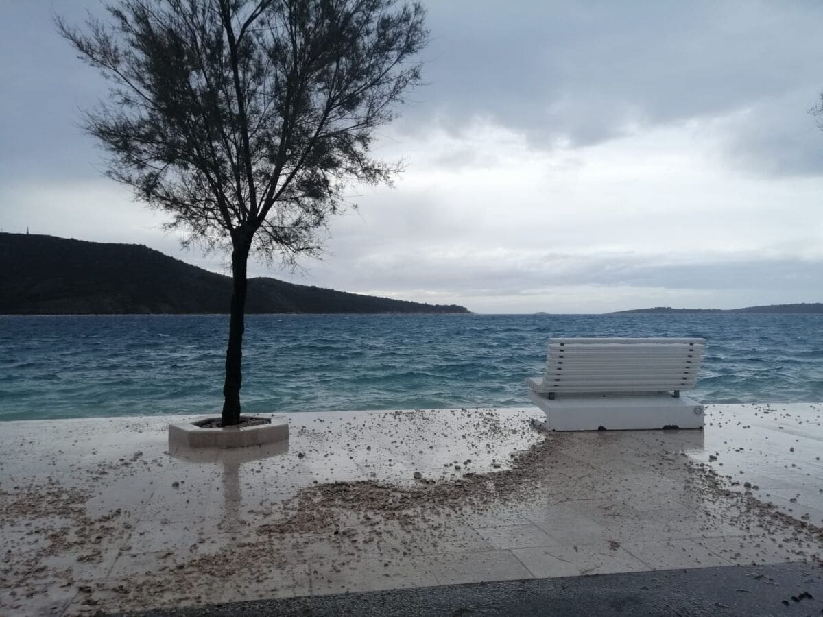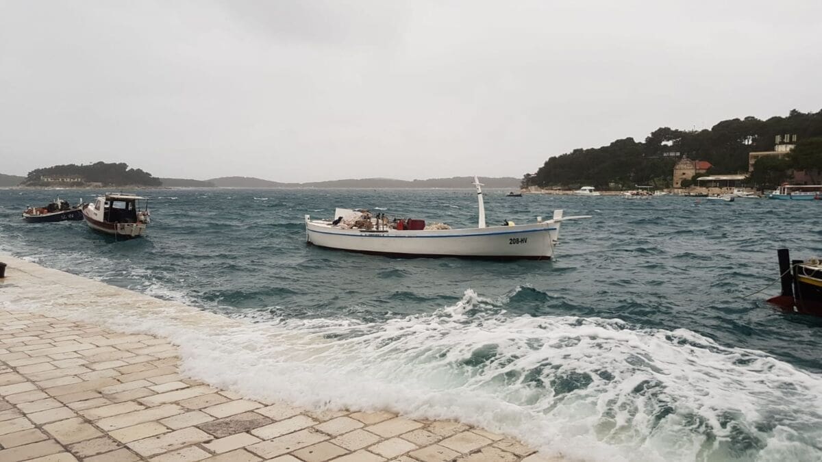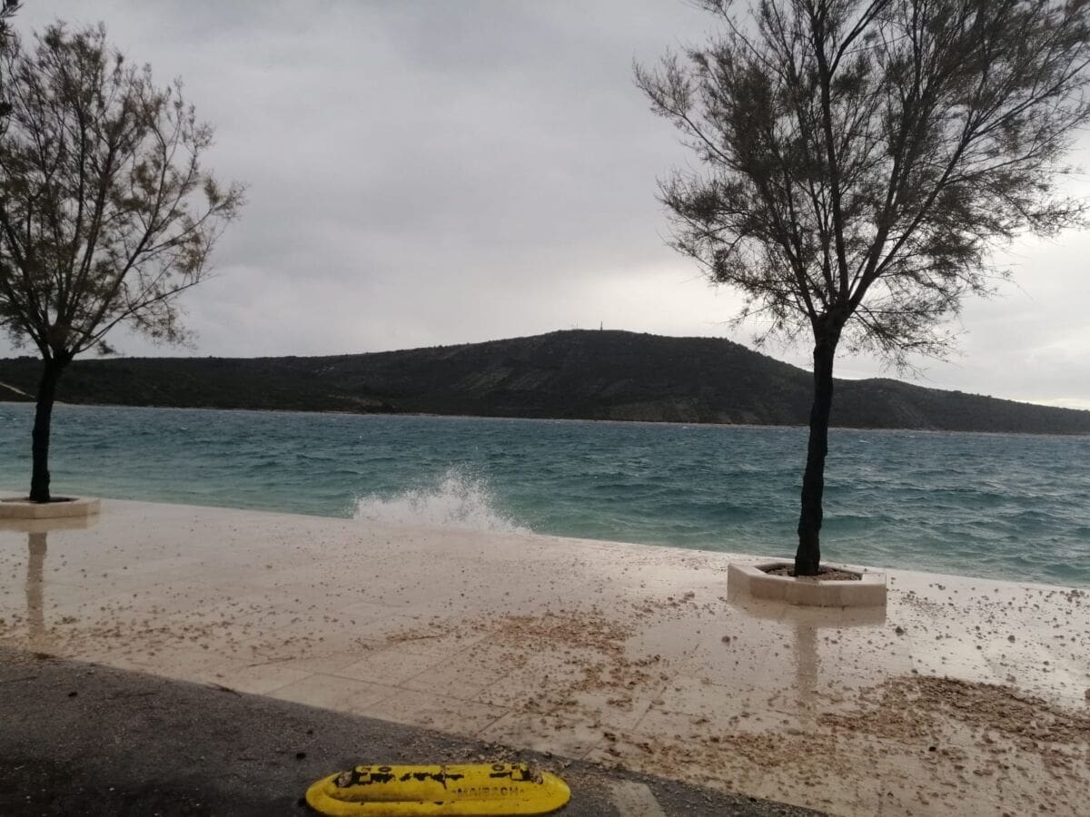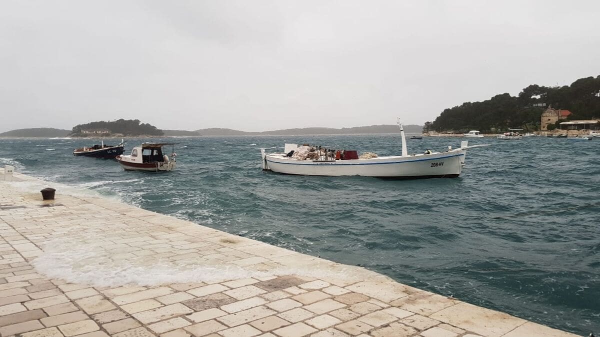 Tako je otok Hvar u potpunosti odsječen od kopna. Linije prema Supetru i Šolti trenutno voze. Prema Visu je jutros isplovio trajekt, no njegovo isplovljavanje upitno je za drugi dio dana. Zbog niskog tlaka zraka došlo je do pojave ciklonalne plime. Tako se i jutros more izlilo na rivu u gradu Hvaru, a pojava će diljem Dalmacije biti intenzivnija sredinom dana.