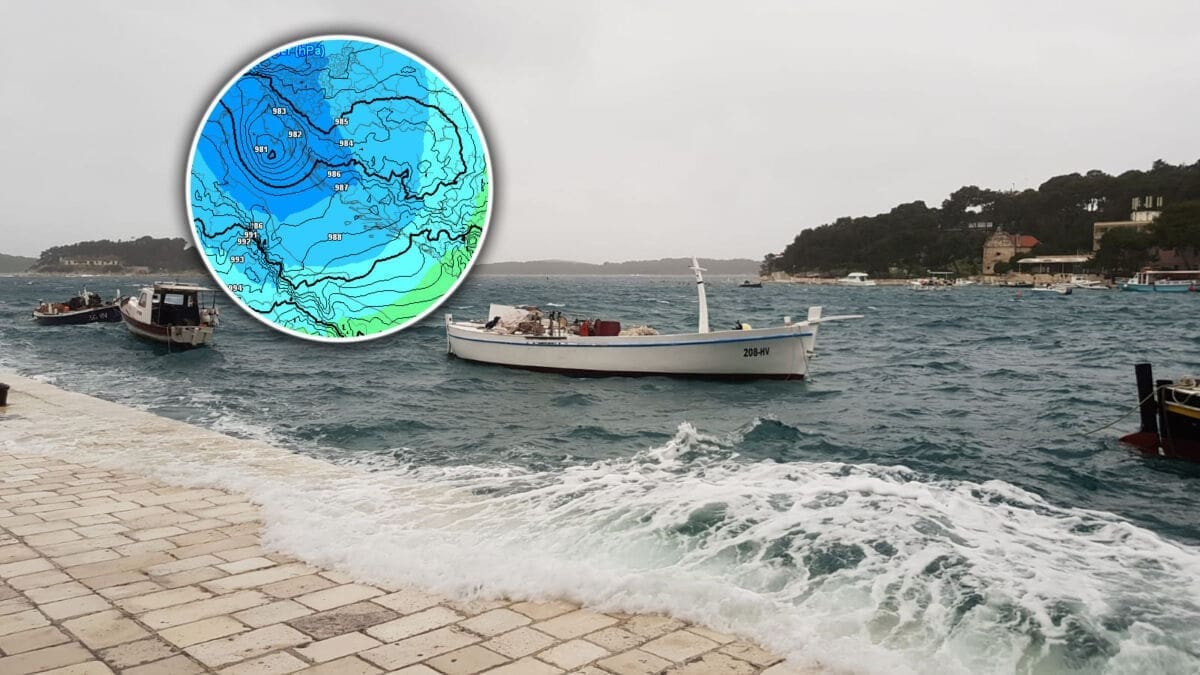 Njen centar nalazi se nad sjevernim Jadranom, i tamo je tlak pao na vrlo niskih 980 hPa na razini mora. Na cijelom Jadranu prevladava oblačno s kišom, pljuskovima i grmljavinom, tako da su do deset sati već pale značajne količine kiše.