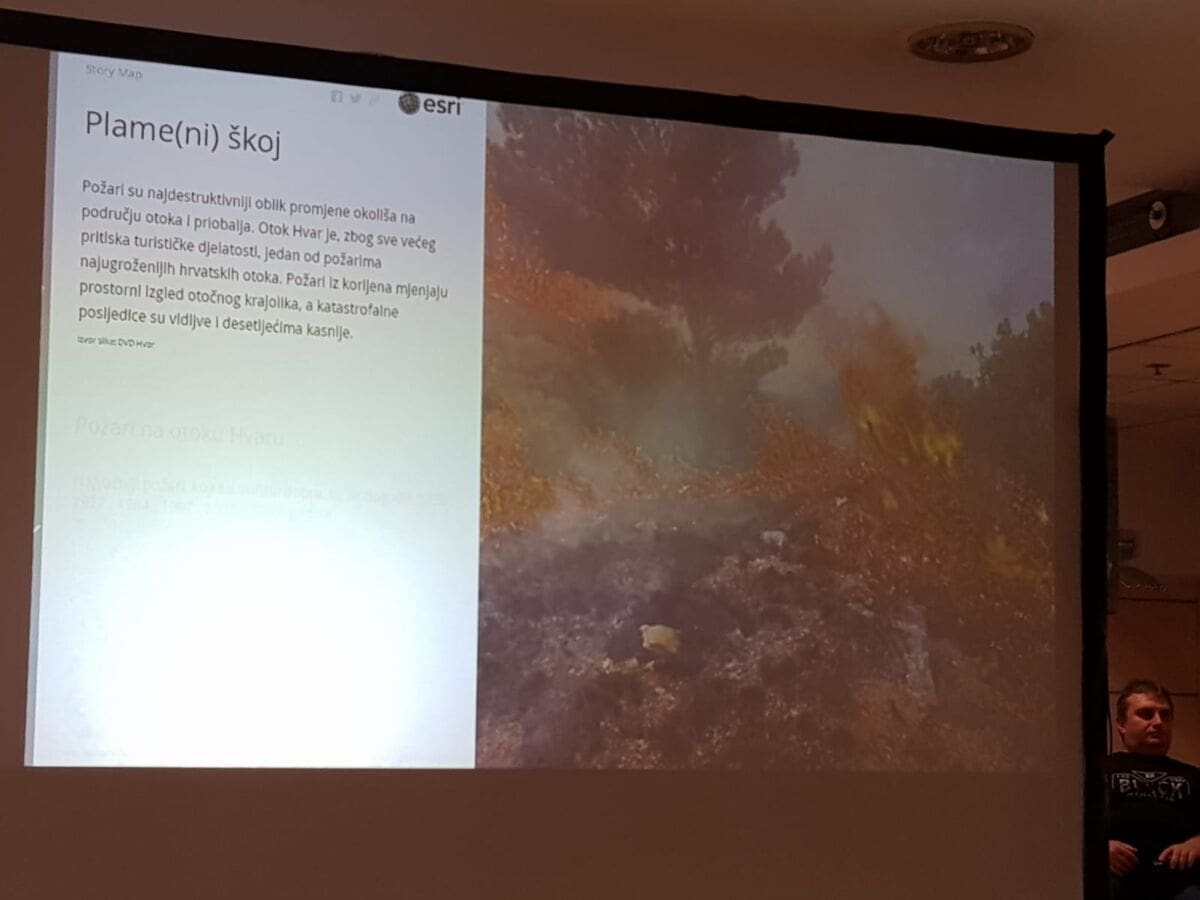 Učenici 3. razreda Srednje škole Hvar - Miko Knezović, Gabrijela Jurić, Šime Vidmar te Nives Ivanković kreirali su StoryMap aplikaciju "Plame(ni) škoj". Koristeći satelitske i terenske podatke analizirali su prostorni obuhvat i posljedice velikog požara koji je zahvatio otok 2003. godine, usporedili ih s današnjim stanjem te iznijeli modele održivog predviđanja i praćenja požara u budućnosti čime su osvojili nagradu za najbolji rad u kategoriji razvoja aplikacija u šumarstvu i poljoprivredi napravljenih u ArcGIS Online okružju.
