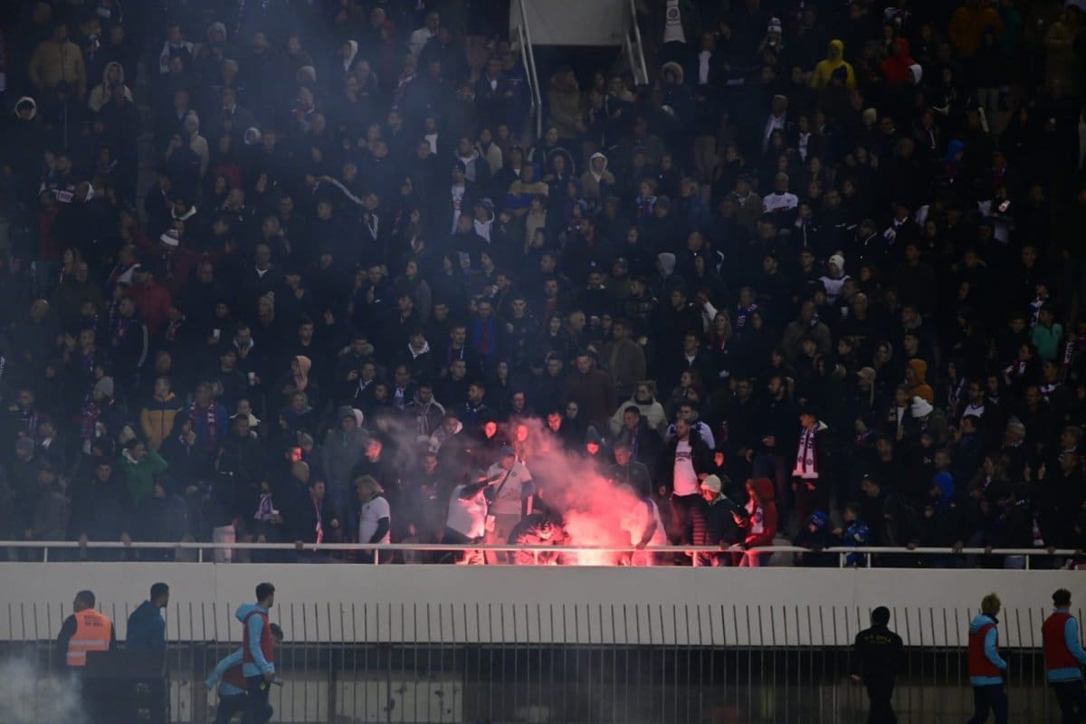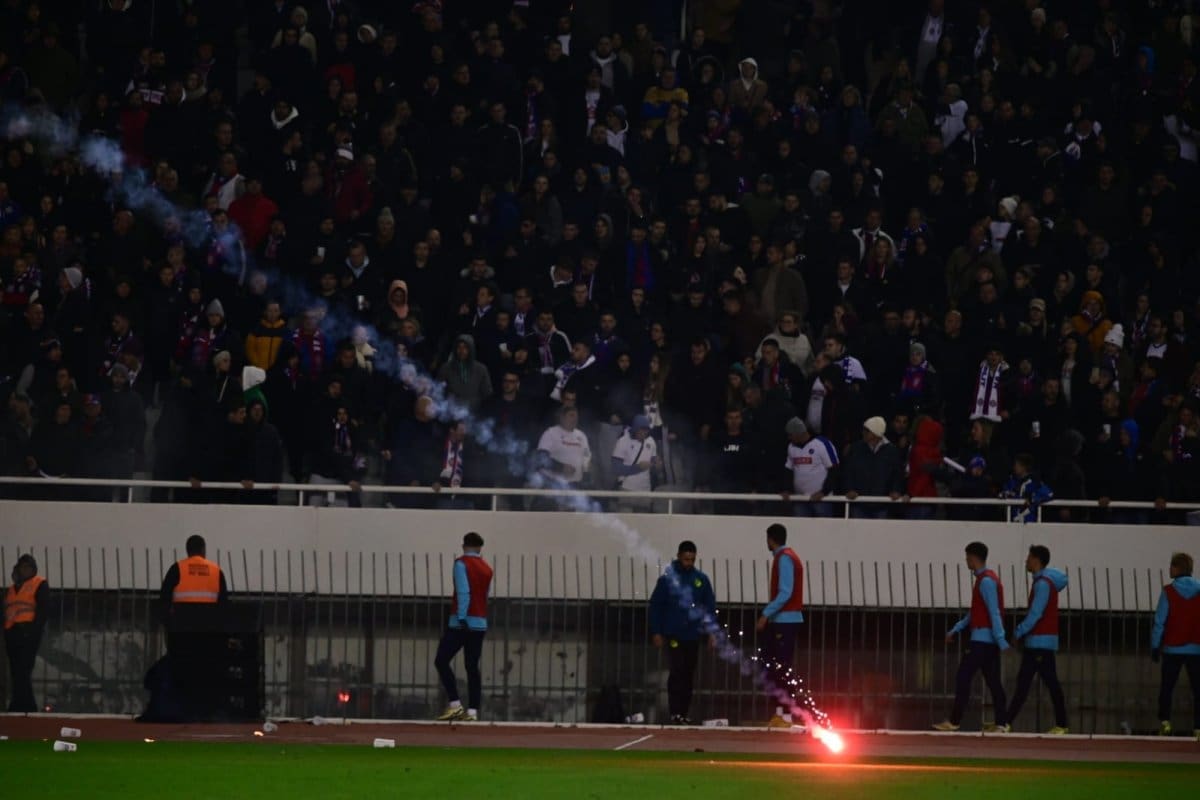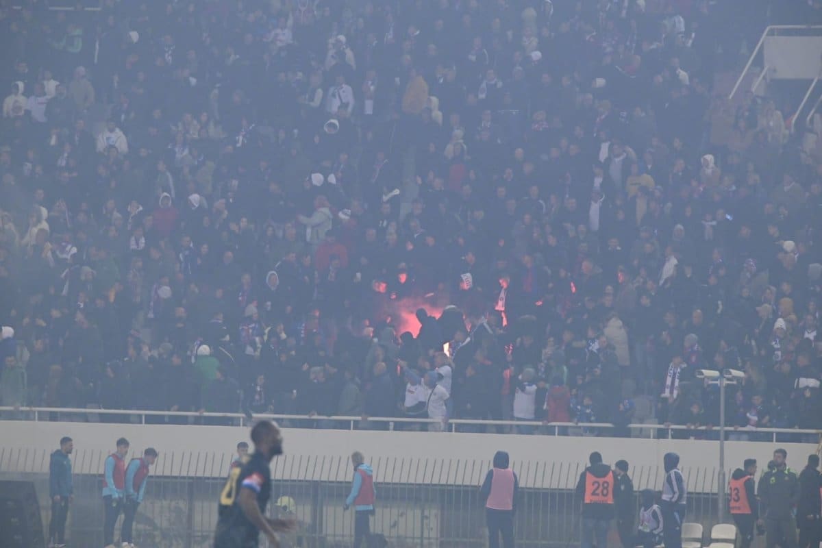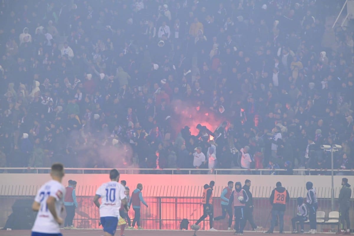U 74.minuti, Igra je nastavljena nakon 4 minute, a BBB bacili su dvije bengalke na zapadnu tribinu među navijače.