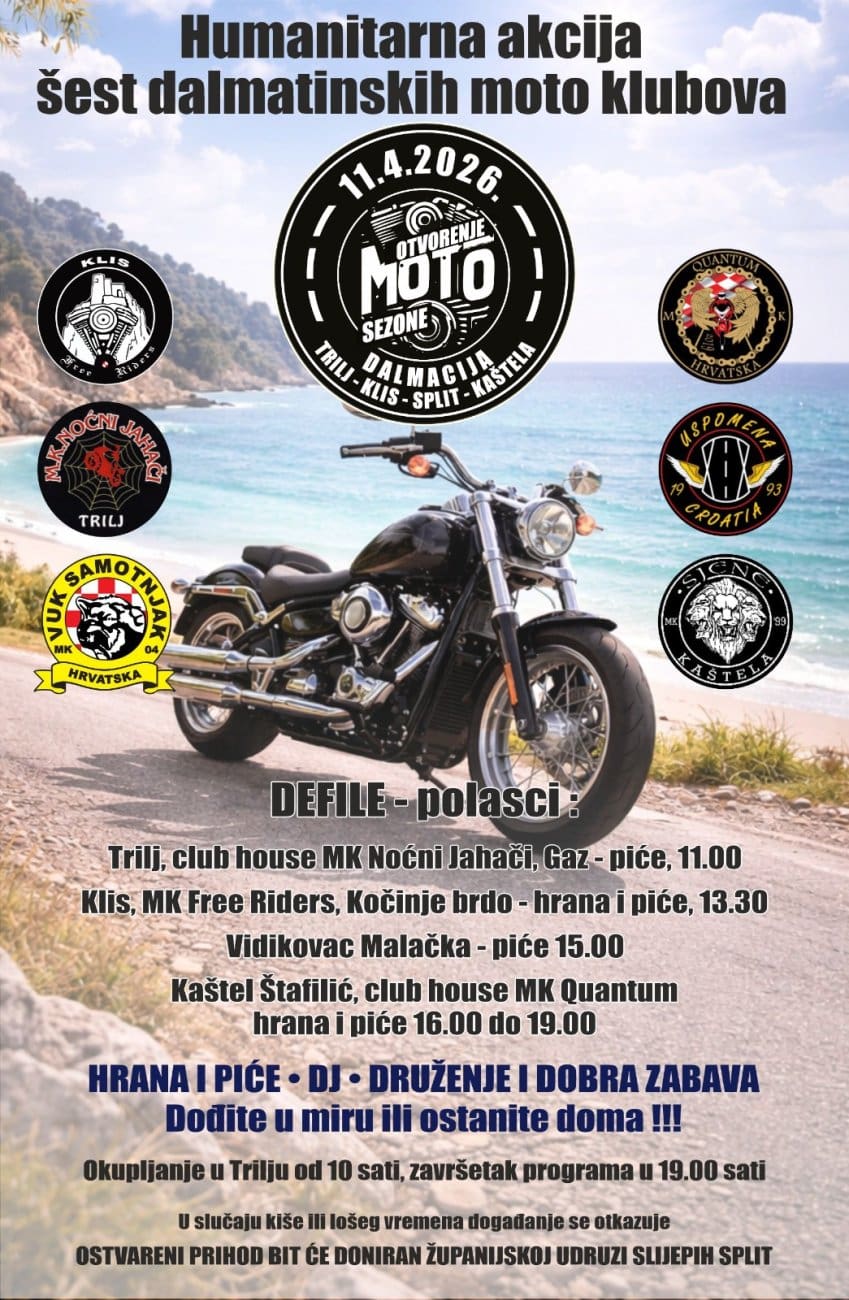 „Završna postaja tradicionalno je u Kaštelima, ovaj put kod Moto kluba Quantum. Tamo od 16 sati, kako to već ide, bit će zabava – spiza, piće, dobra glazba i druženje bez puno filozofije. Program će trajati do 19 sati, a sav ostvareni prihod ide Županijskoj udruzi slijepih“, kaže predsjednik MK Sjena Marko Konta.