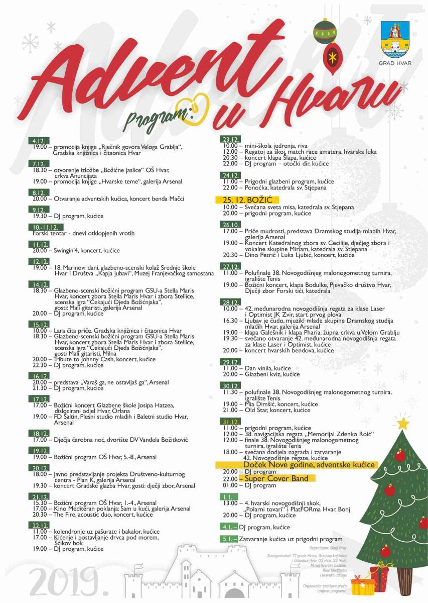 Osim na kućicama na Rivi, program će se do 5. siječnja održavati u galeriji Arsenal, u Arsenalu i u katedrali. Neće nedostajati ni zabavnih aktivnosti za djecu kao ni sportskih događanja. Uz 42. međunarodnu novogodišnju regatu za optimiste i lasere u organizaciji JK Zvir te 38. malonogometni novogodišnji turnir Udruge za mali nogomet Hvar koji tradicionalno završavaju na Staru godinu, tijekom prosinca održat će se prijateljski nogometni susreti te jedriličarski match race za amatere „Regatoj za škoje“ 23. prosinca uz radionice za djecu i odrasle. Osim koncerata gradskih glazbenih društava, DJ-programa, nastupa otočkih bendova te glazbenika iz Splita, Kaštela i Zagreba, ove godine će se na kućicama održati i Dan vinila uz puštanje glazbe s gramofonskih ploča te glazbeni kviz kao nastavak zanimljive zimske aktivnosti koja je pobudila zanimanje otočana prošle zime.