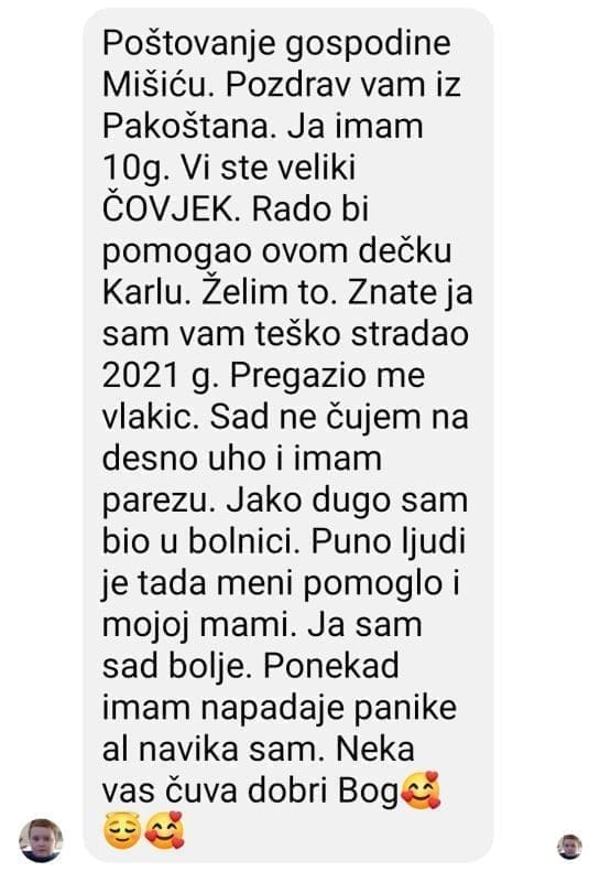„Za Krala i njegovu obitelj sam se od prošle godine uključio u humanitarnu akciju. Motor ću pokloniti da se skupi novac za isplatu stana i Karlovo liječenje. Ovo nije zadnja donacija i sada ćemo pokušati pokrenuti puno veću donaciju jer se pojavio novi problem“, kazuje nam Mišić te nam ustupa emotivnu poruku koju je nakon ovog poteza primio od jednog dječaka iz Pakoštana.