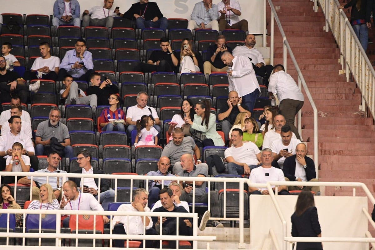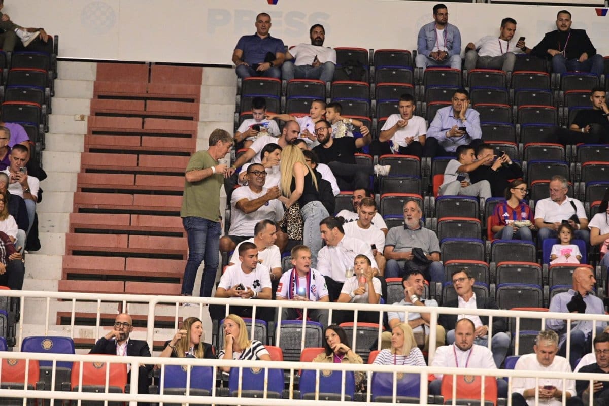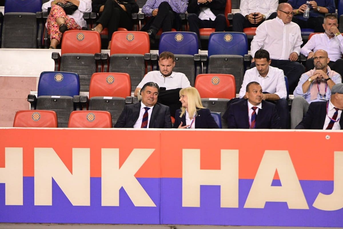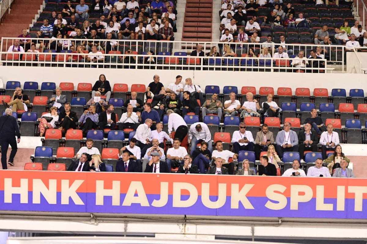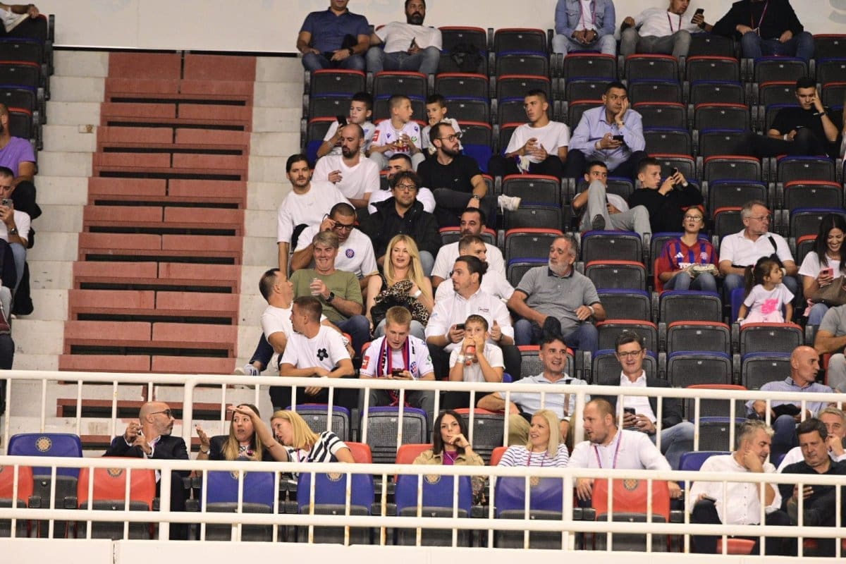 Utakmicu prate brojni navijači, a nisu je propustile ni supruge igrača Hajduka. Tako smo uspjeli uhvatiti Livajinu suprugu Iris, ali i Rakitićevu suprugu Raquel.