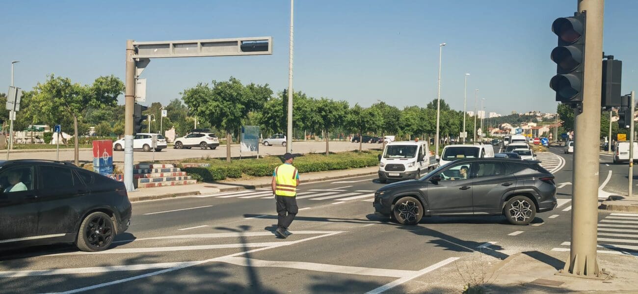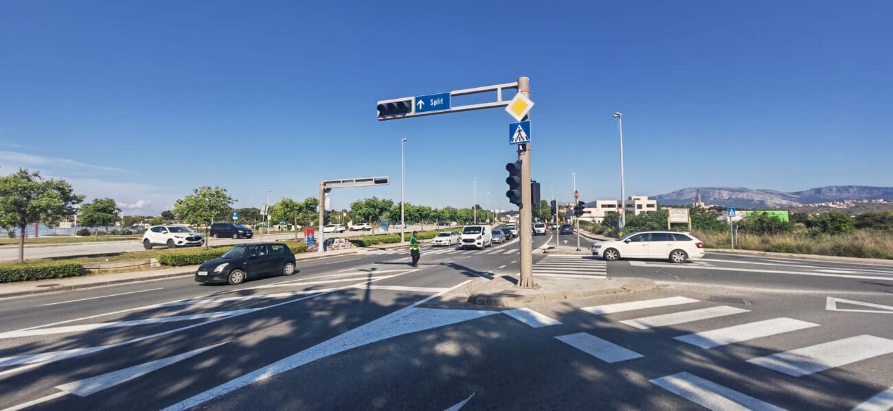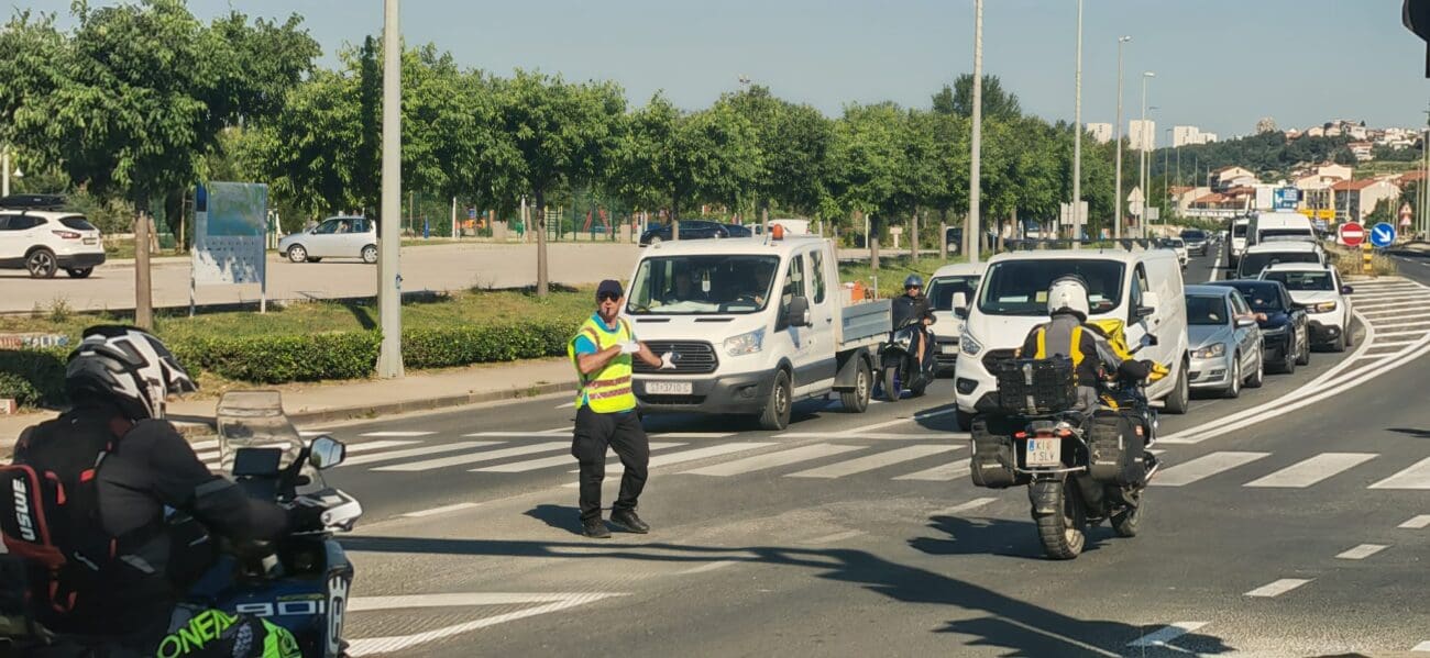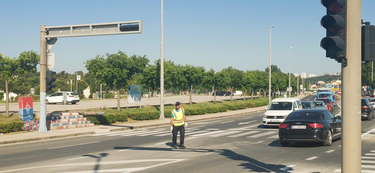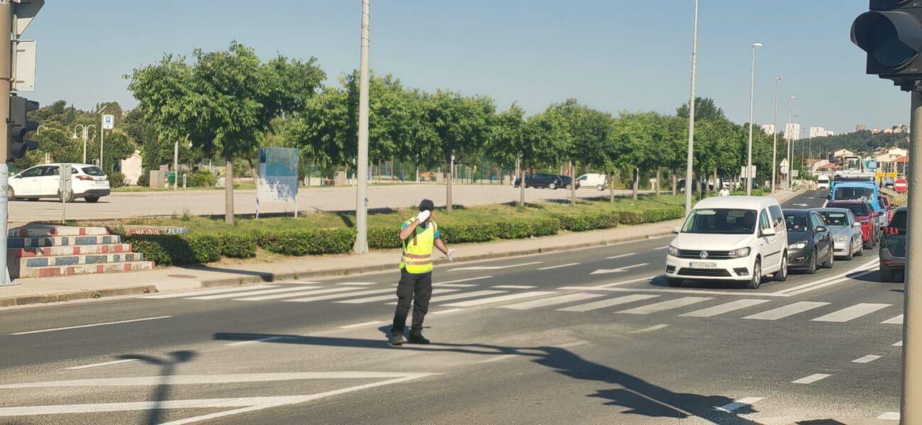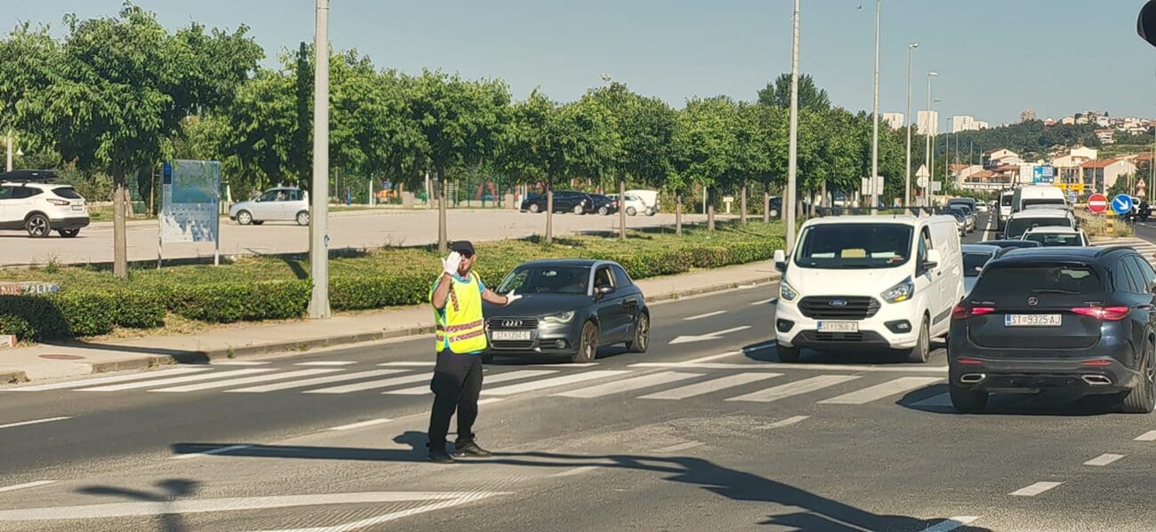 Prometni redar Mate Glibota, smireno i pažljivo, regulira promet i pazi da promet kroz raskrižje Stobreča i TTTS-a teče glatko.