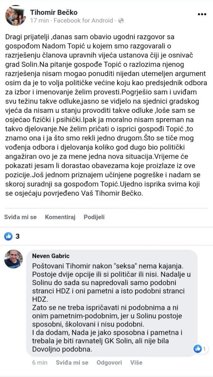 Među ostalim je napisao "Na pitanje gospođe Topić o razlozima njenog razrješenja nisam mogao ponuditi nijedan utemeljen argument osim da je to volja političke većine koju kao predsjednik odbora za izbor i imenovanje želim provesti. Pogriješio sam i uviđam svu težinu takve odluke, jasno se vidjelo na sjednici gradskog vijeća da nisam u stanju provoditi takve odluke, loše sam se osjećao psihički i fizički. Ipak ja moralno nisam spreman na takvo djelovanje", dio je njegove objave koju je vrlo brzo povukao sa svojeg profila.