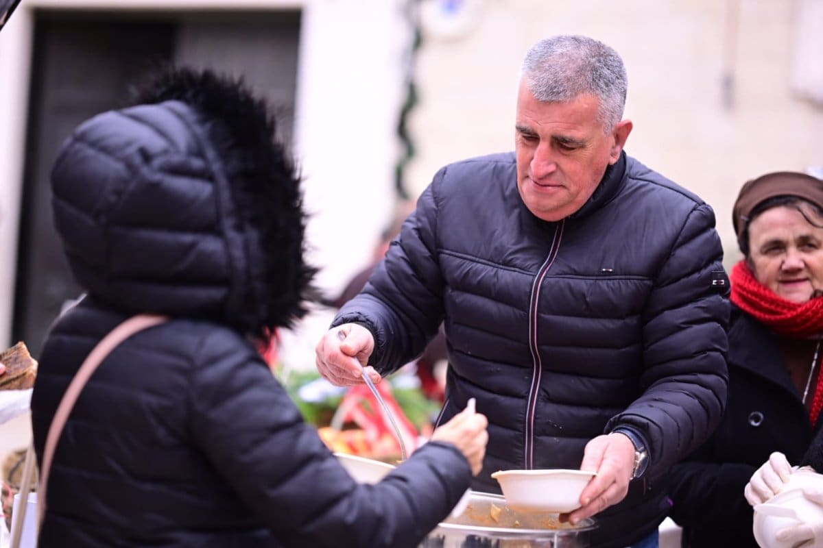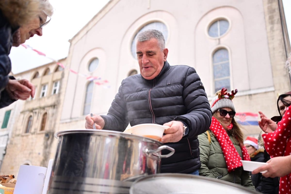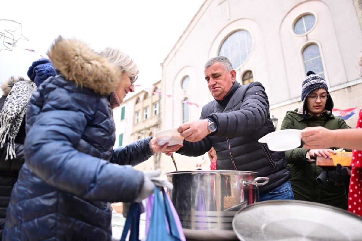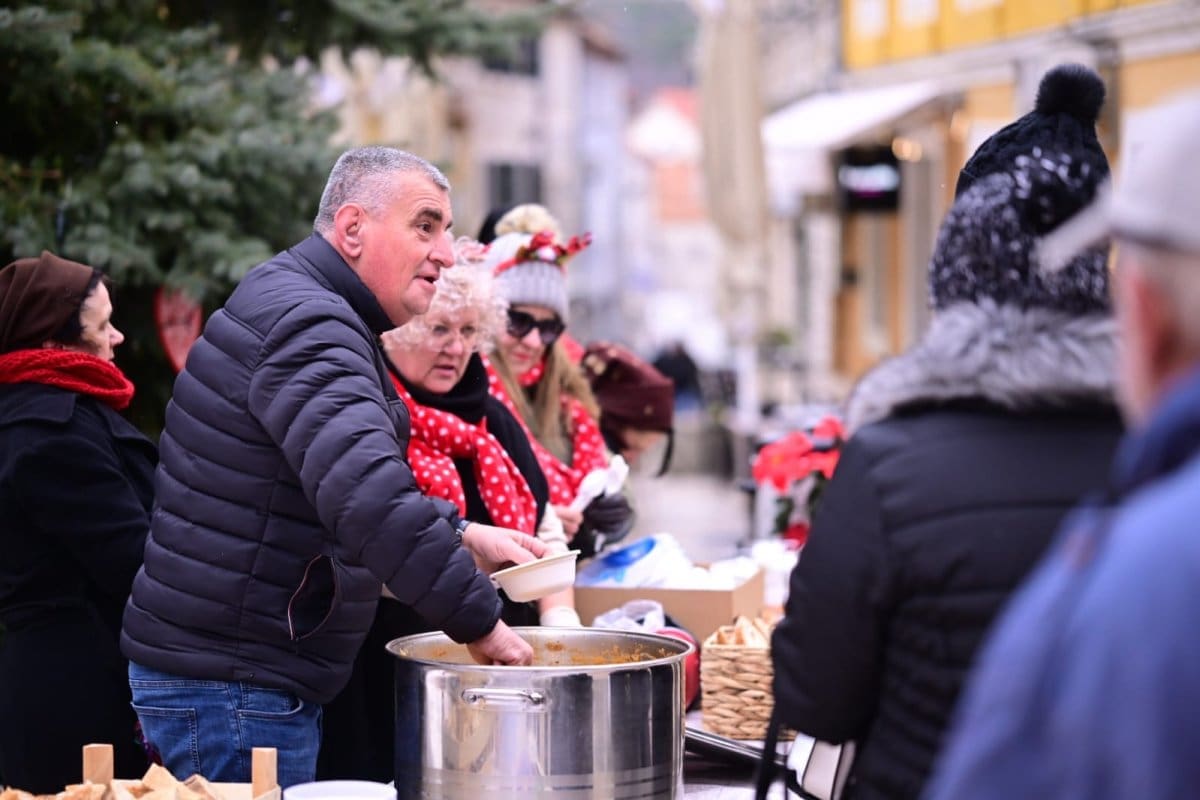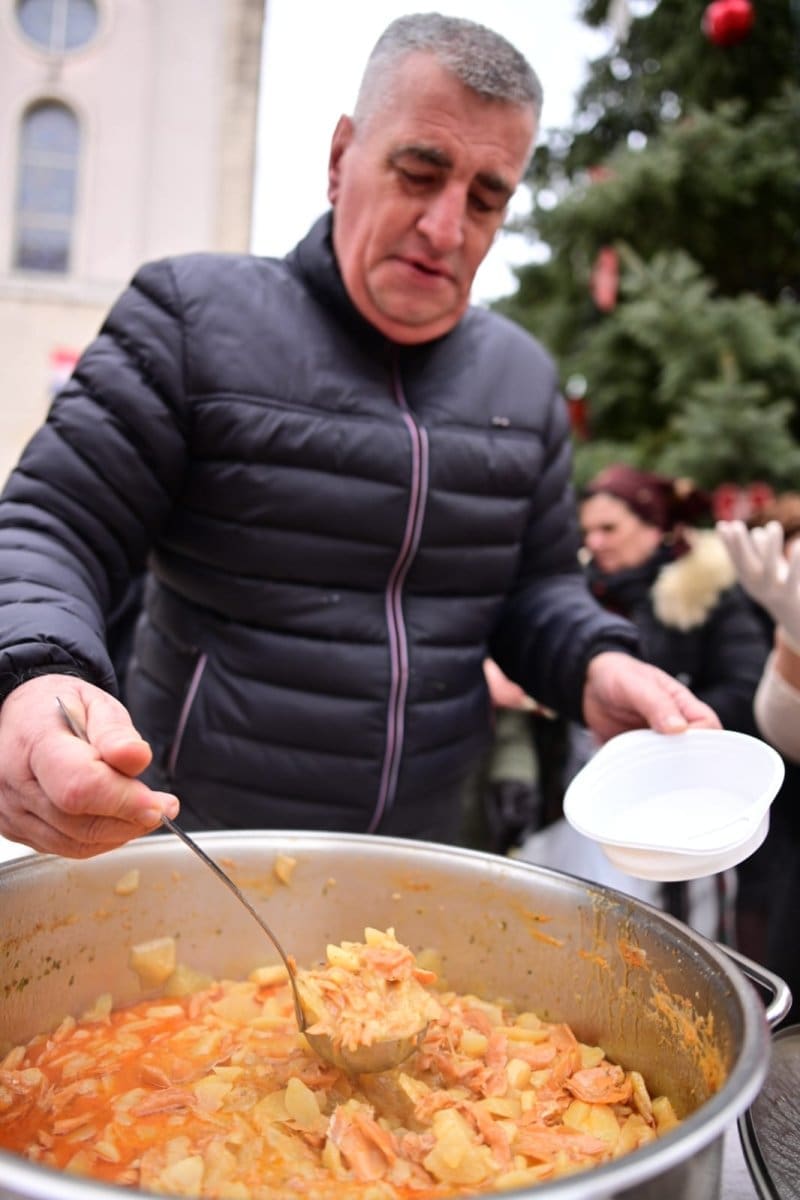 Centar Sinja danas je bio pun, usprkos buri koja nas je ohladila posljednja dva dana. Badnji je dan, a tradicija je da se na Badnjak jede bakalar. Tako su i Sinjani imali priliku probati bakalar, a servirao im ga je, među ostalima, i gradonačelnik Miro Bulj.