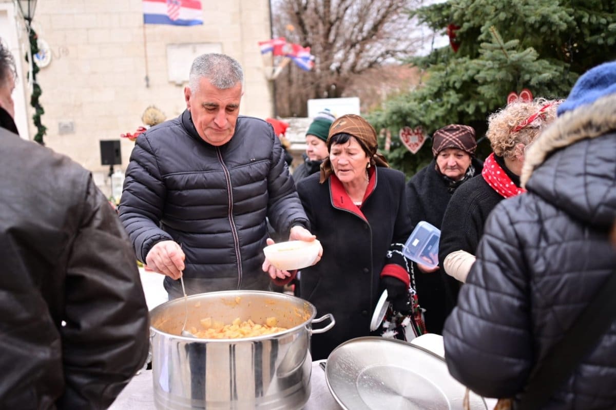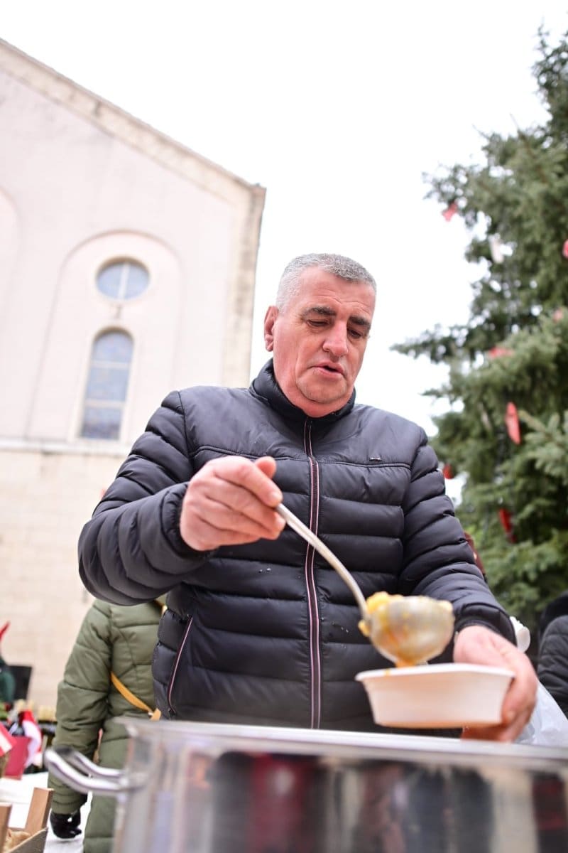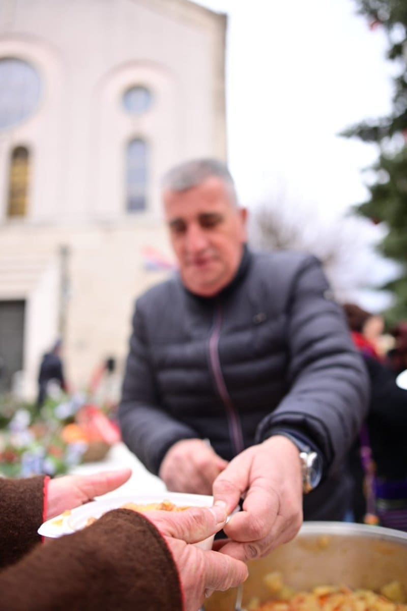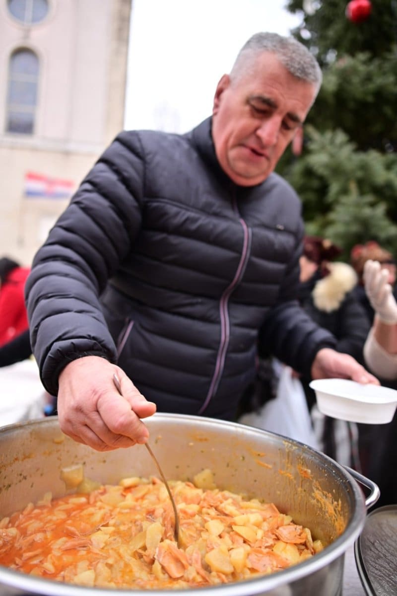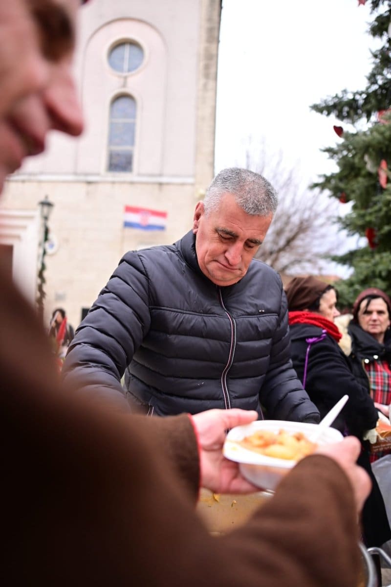 Centar Sinja danas je bio pun, usprkos buri koja nas je ohladila posljednja dva dana. Badnji je dan, a tradicija je da se na Badnjak jede bakalar. Tako su i Sinjani imali priliku probati bakalar, a servirao im ga je, među ostalima, i gradonačelnik Miro Bulj.
