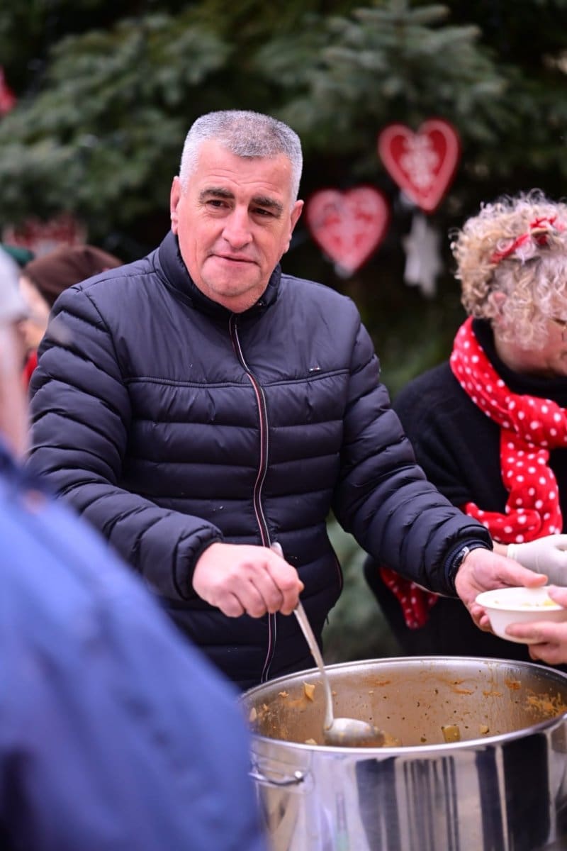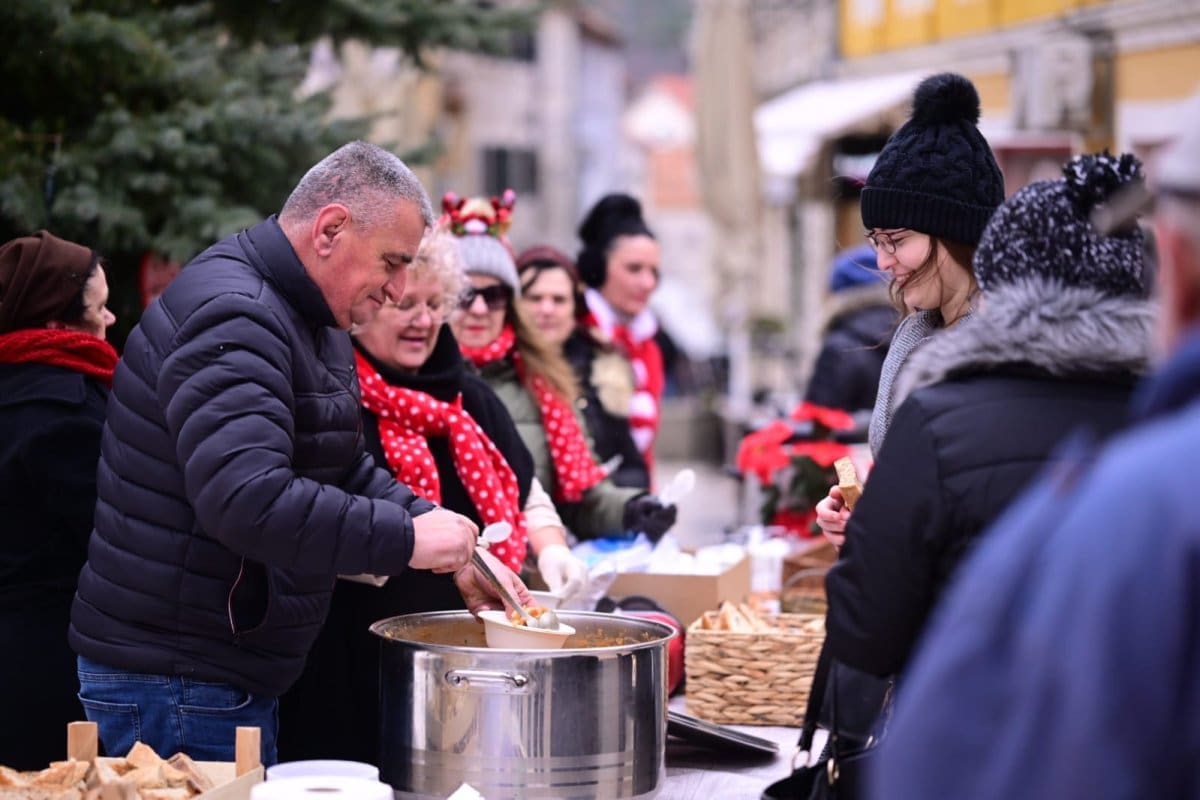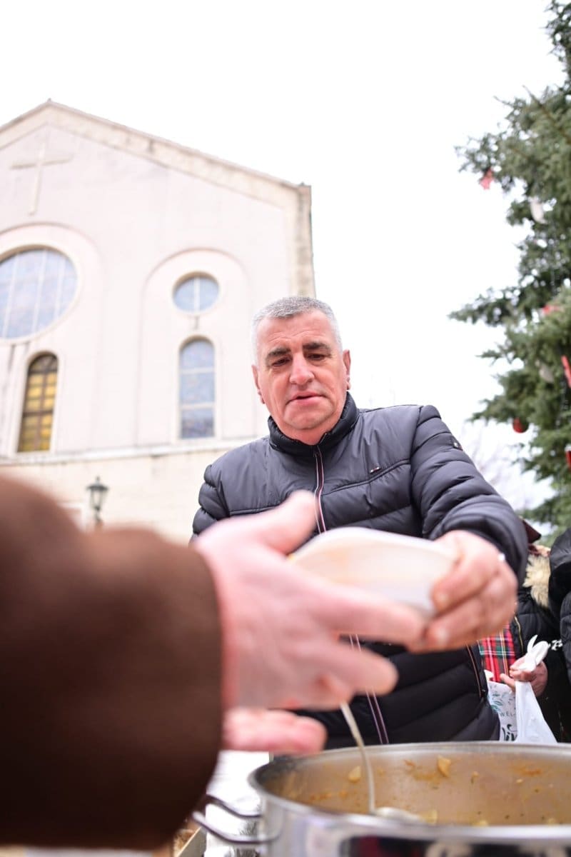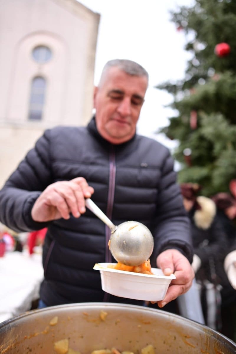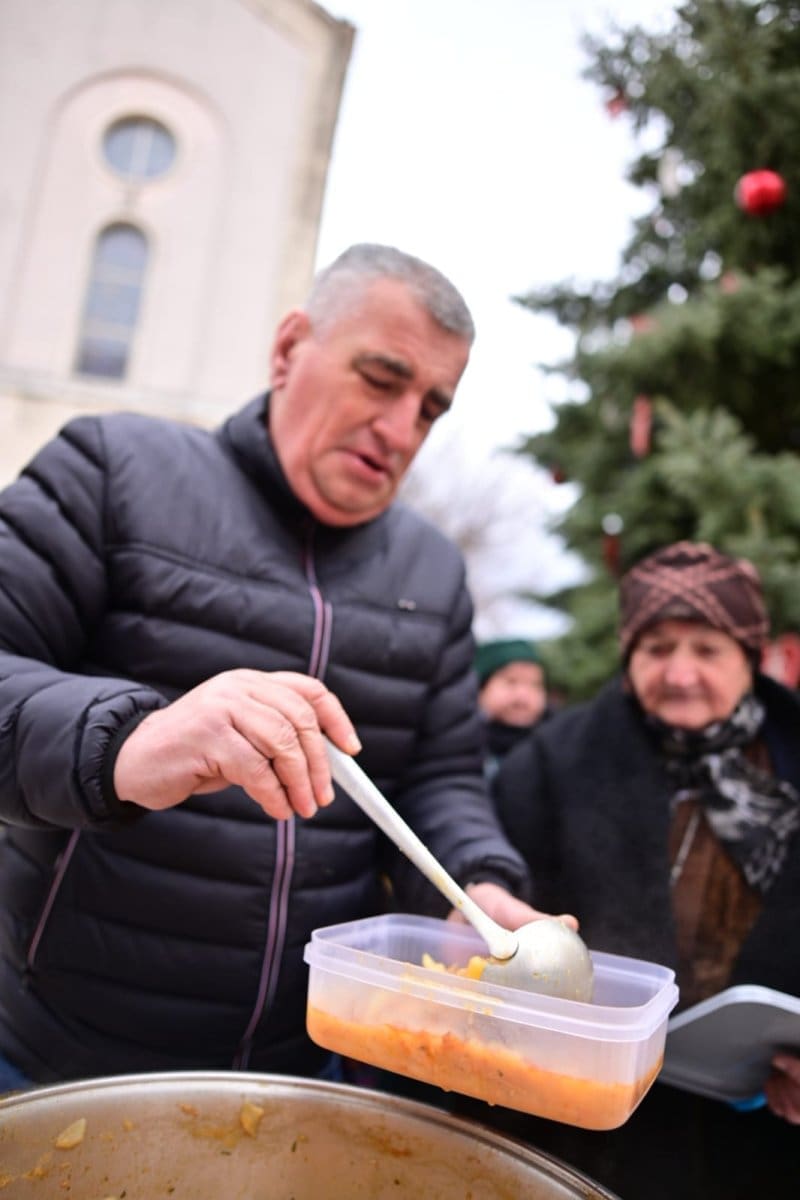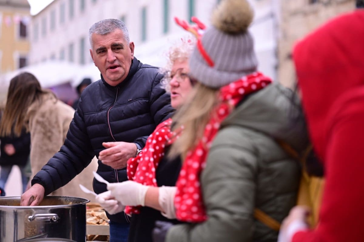 Centar Sinja danas je bio pun, usprkos buri koja nas je ohladila posljednja dva dana. Badnji je dan, a tradicija je da se na Badnjak jede bakalar. Tako su i Sinjani imali priliku probati bakalar, a servirao im ga je, među ostalima, i gradonačelnik Miro Bulj.