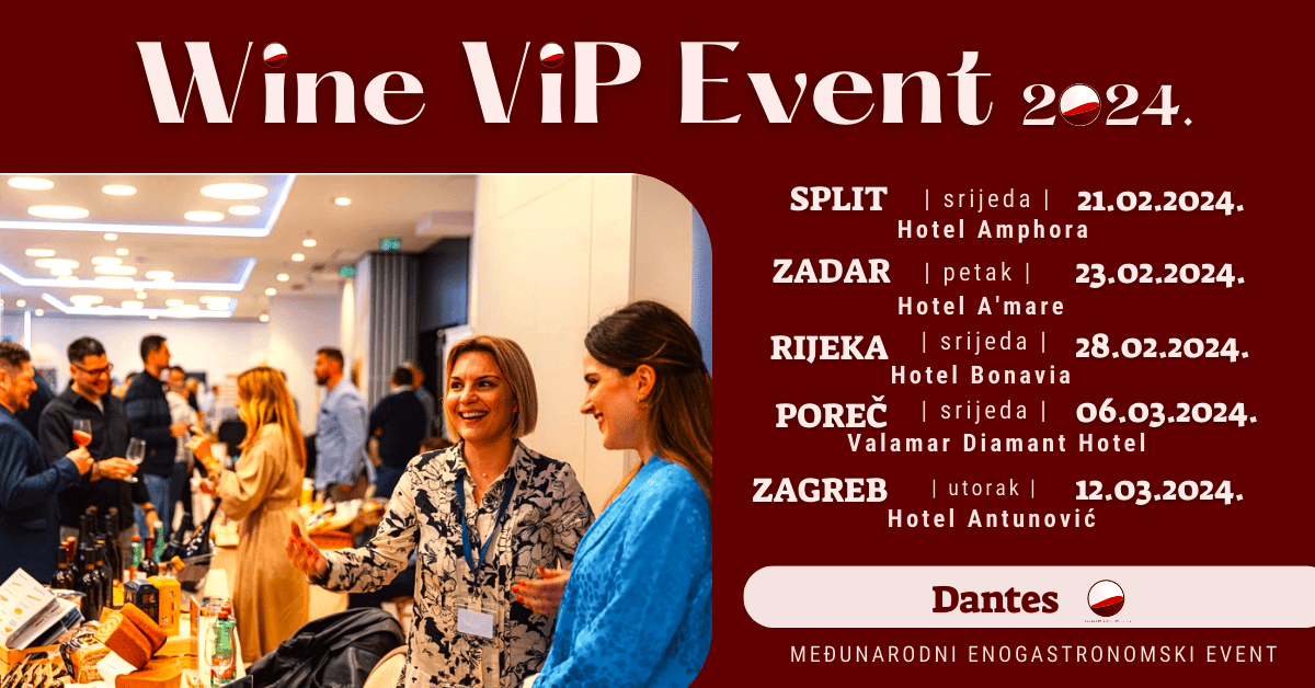 Dantes sa svojim timom agencije odlučio se na ovaj za njih vrlo poseban dan i 19-ti rođendan agencije podijeliti sa javnošću informaciju o dogovorenim terminima 5 Wine ViP Evenata u 2024. godini. Eventi u 2023. godini bili su do sada najbolje posjećeni, a prema najavama i vrlo velikom interesu partnera i suradnika kao i gostiju očekuje se da će eventi u 2024. godini biti u najmanju ruku fantastični.