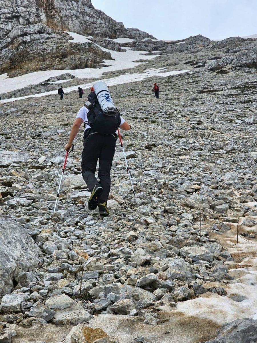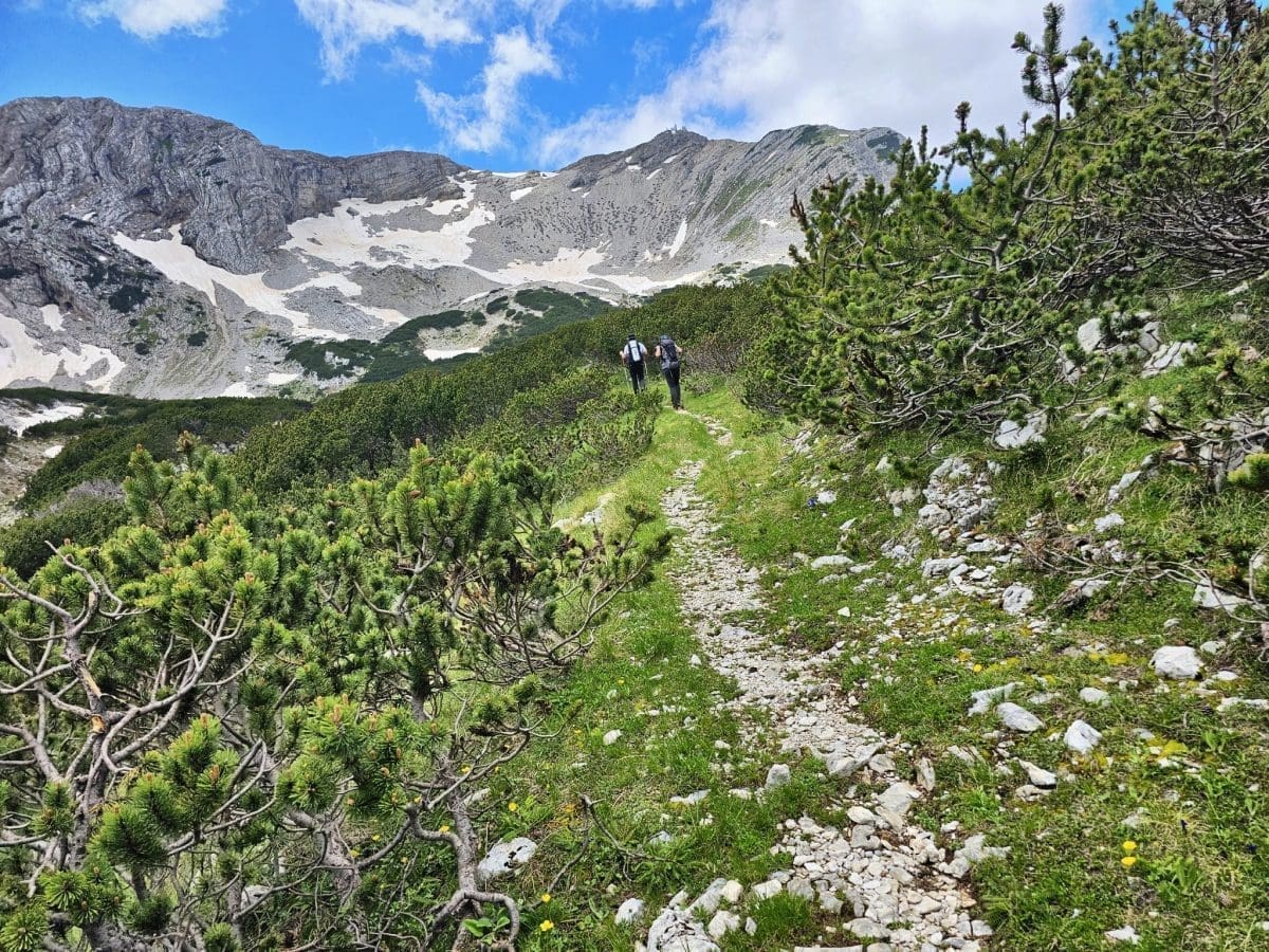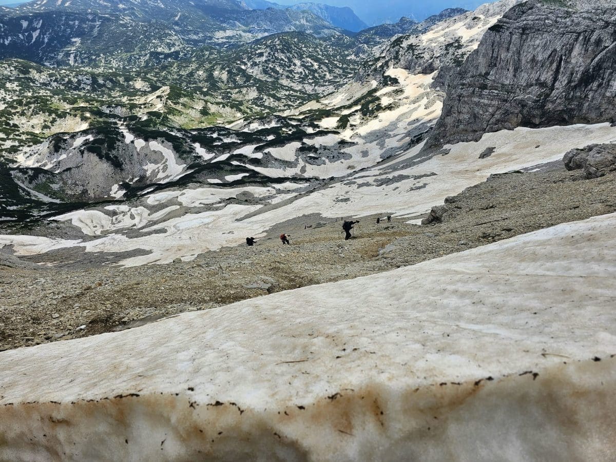 Vremenske prilike bile su gotovo idealne za planinariti jer je bilo pretežno oblačno i suho, veći dio puta uz slab vjetar. Staza je dobro označena i prolazi i kroz šumu i kroz sipare. Na oko 2000 metara kreću prvi tragovi snijega i leda na tlu. Ipak, radi se o ostacima zimske sezone koji vjerojatno neće dočekati kraj srpnja. Upravo se na tom području osjeti nagli pad temperature što je dodatno osnažio hladan sjeverac koji je osjet hladnoće činio izraženim.