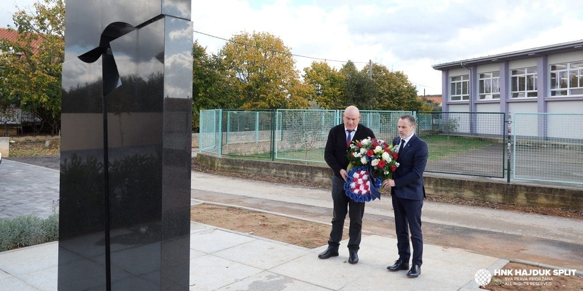 Predsjednik Lukša Jakobušić i voditelj Akademije HNK Hajduk "Luka Kaliterna" Boro Primorac jutros su položili Hajdukov vijenac uz spomen-obilježje masovne grobnice u Škabrnji u čast svim žrtvama.