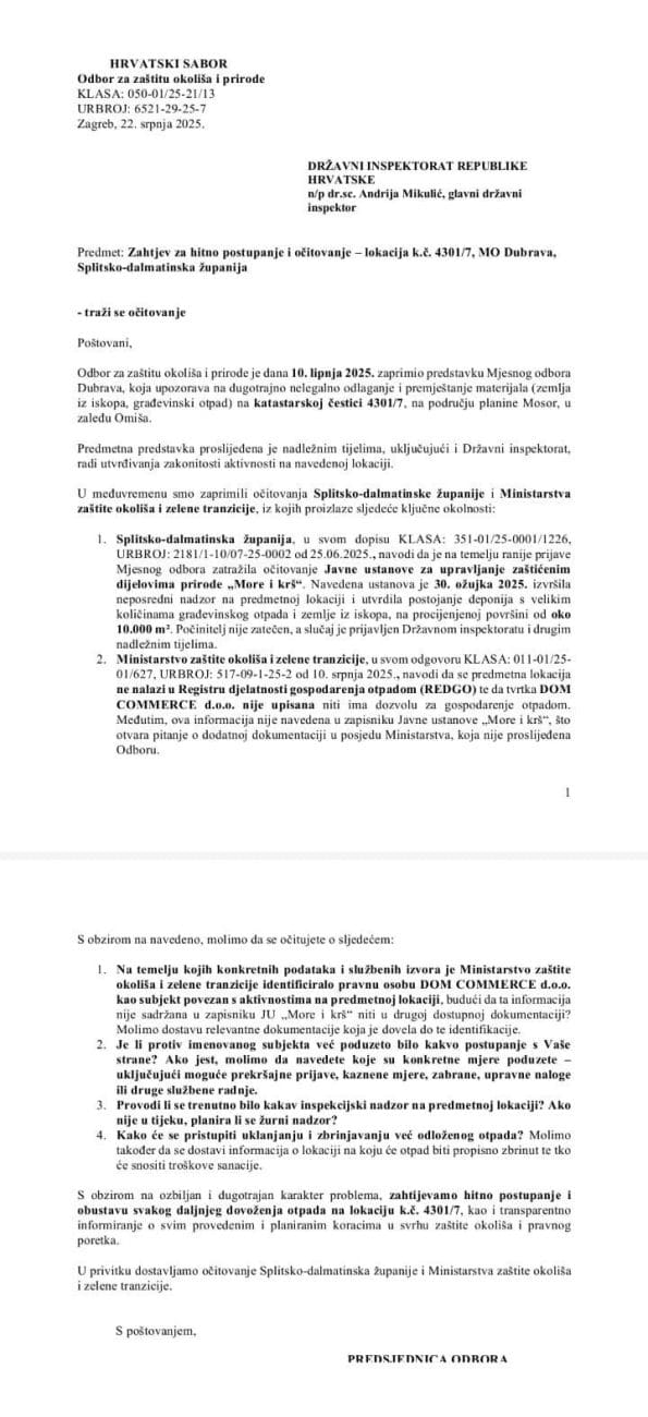 Jer između ostalog traži od Državnog inspektorata RH i Andrije Mikulića kao glavnog državnog inspektora, da se očituje 'na temelju kojih podataka i službenih izvora je Ministarstvo zaštite okoliša i zelene tranzicije identificiralo pravnu osobu Dom Commerce kao subjekt povezan s aktivnostima na predmetnoj lokaciji?' Zanima saborski odbor i 'je li protiv subjekta već poduzeto kakvo postupanje sa strane DIRH-a, i ako jest, koje su konkretne mjere poduzete'…