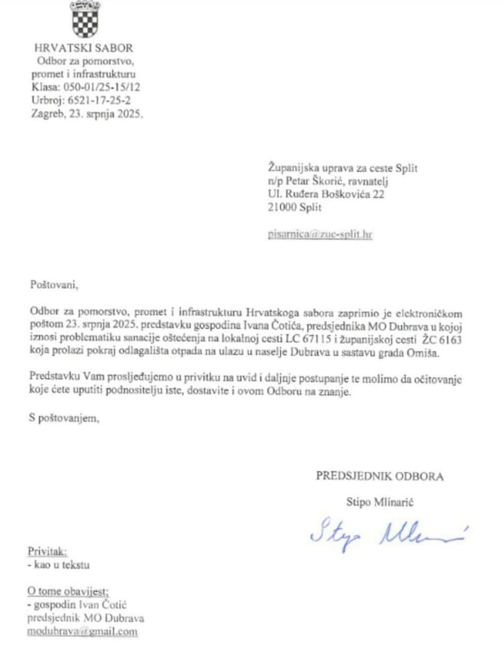 Predsjednik Odbora Stipo Mlinarić Čipe, saborski zastupnik iz redova Domovinskog pokreta, uputio je predstavku Županijskoj upravi za ceste Split, konkretno ravnatelju Petru Škoriću. Traži se od Škorića očitovanje o problemu oštećenja cesta koje prolaze pored odlagališta otpada na ulazu u naselje Dubrava…